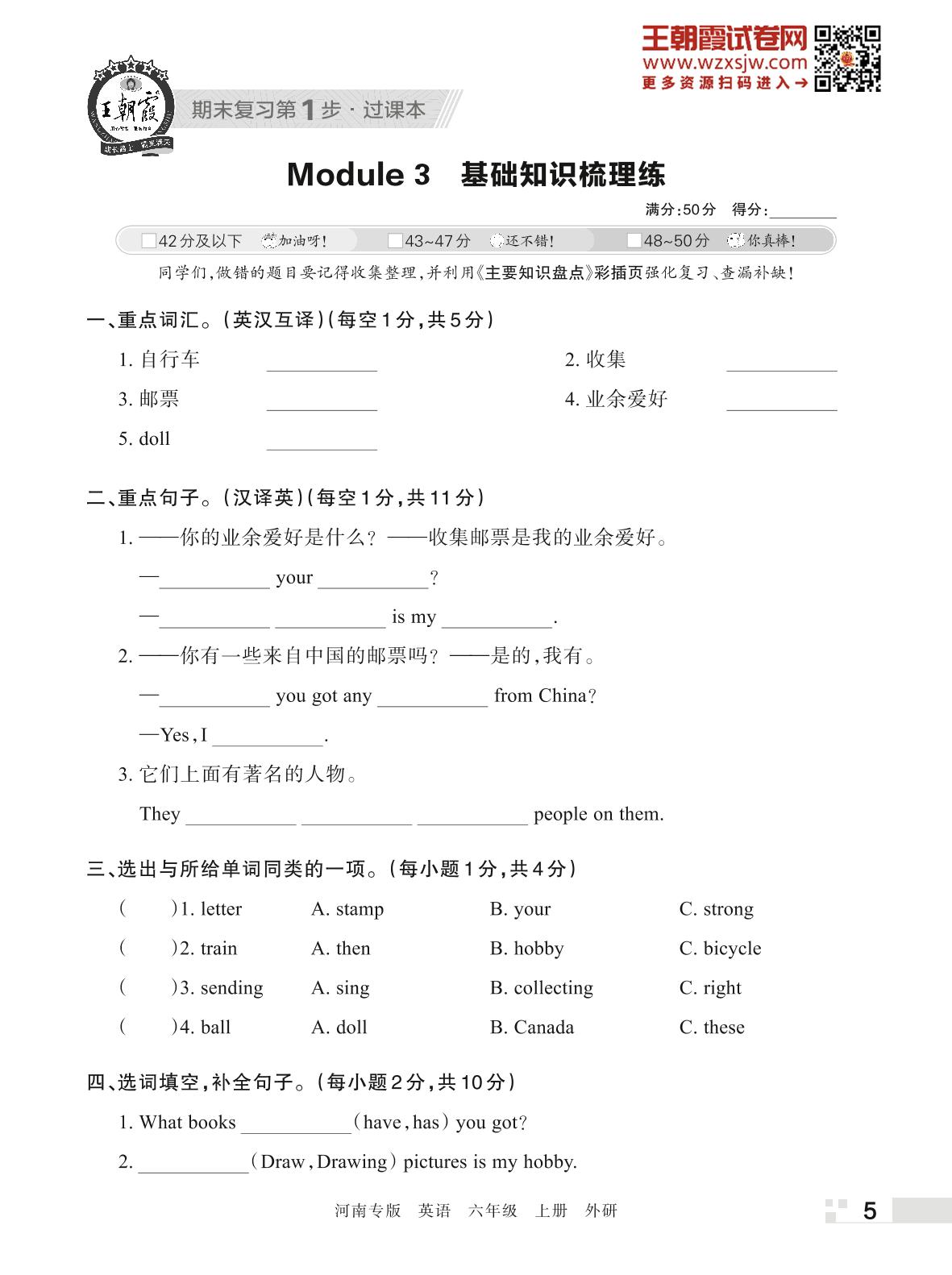 王朝霞期末过课本——Module 3 基础知识梳理练六年级上册英语(外研版)_R221112104107837