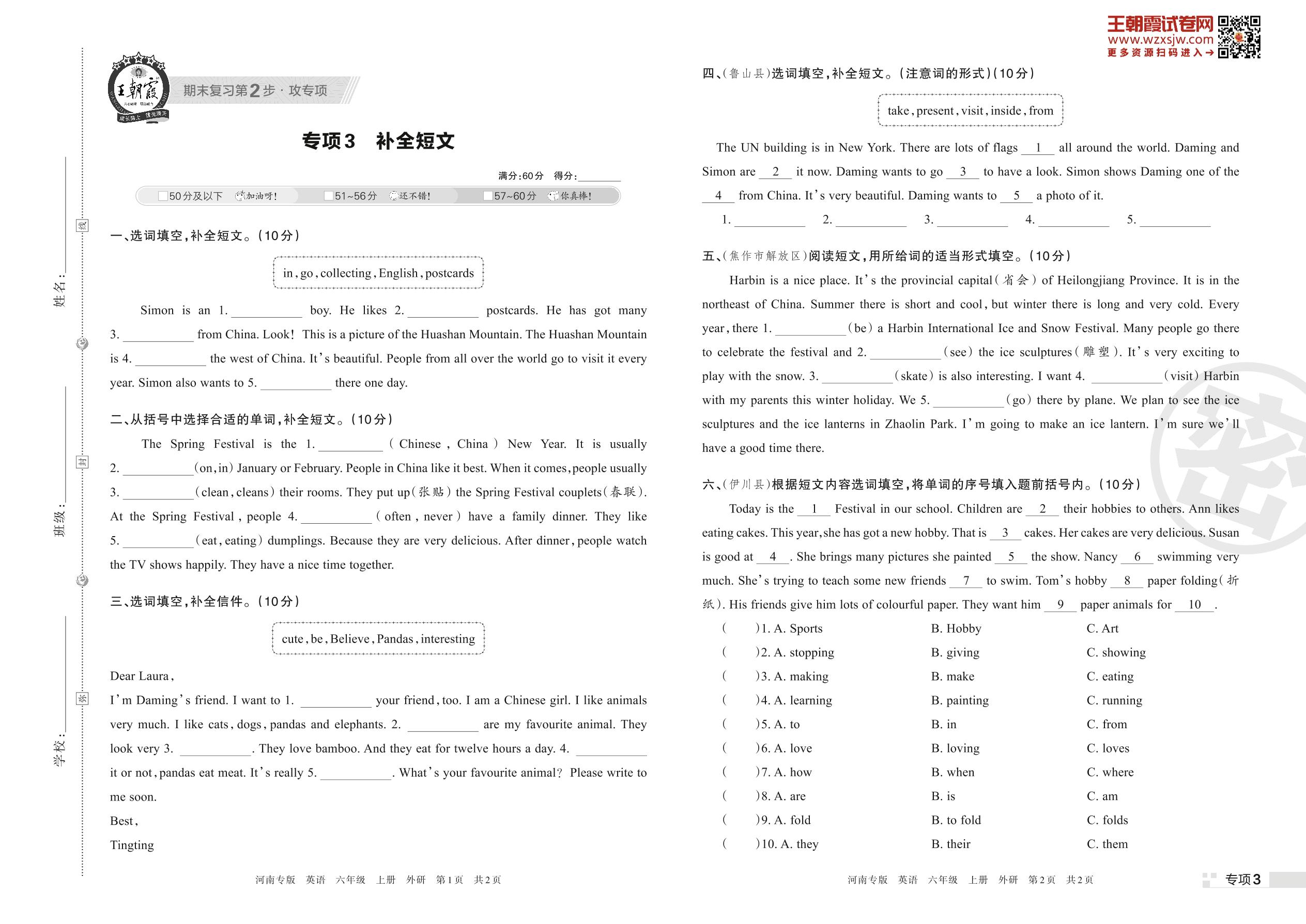王朝霞期末专项卷——补全短文六年级上册英语(外研版)_R221112104109222【3】