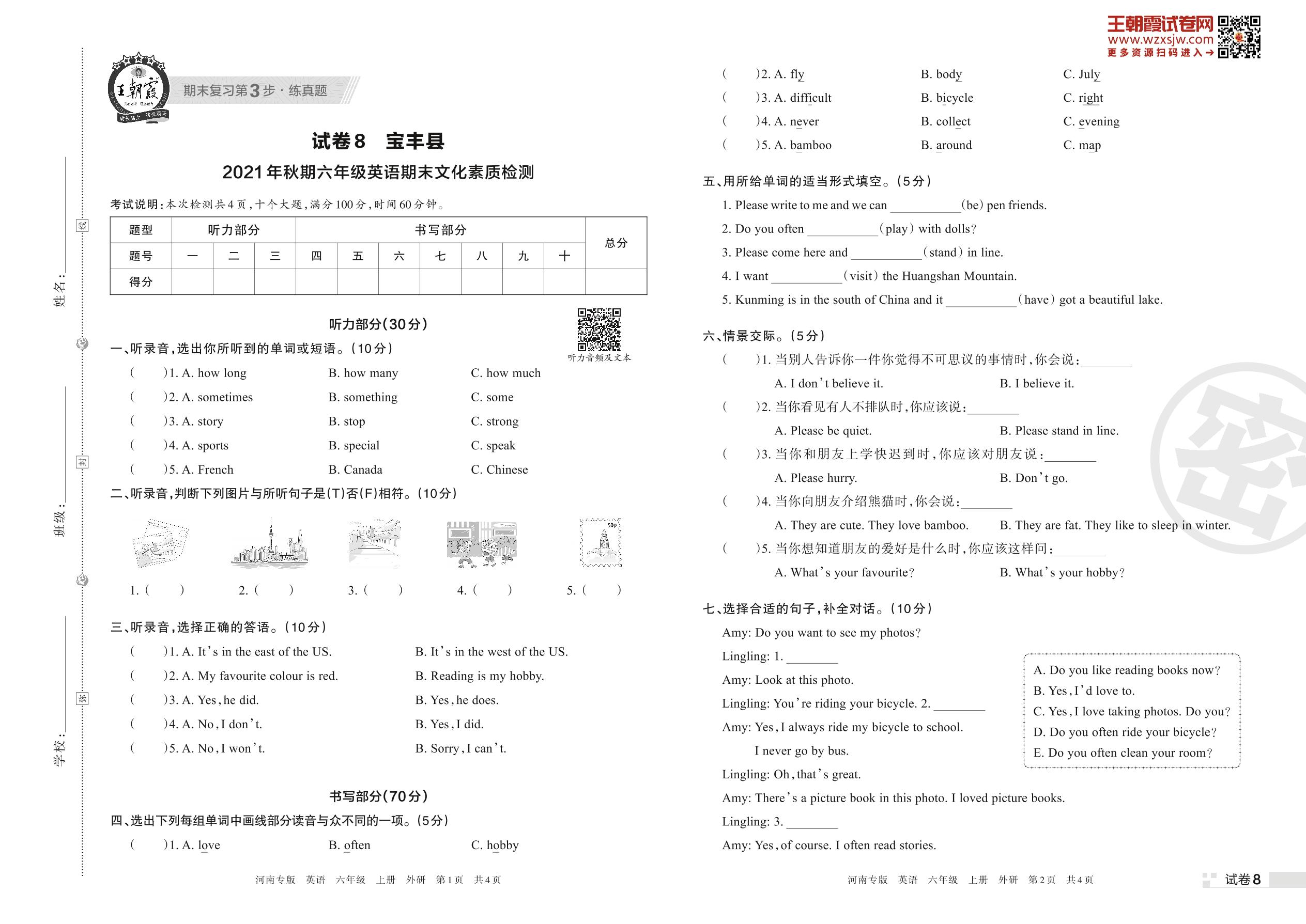 宝丰县2021年秋期六年级英语期末文化素质检测(外研版)【8】