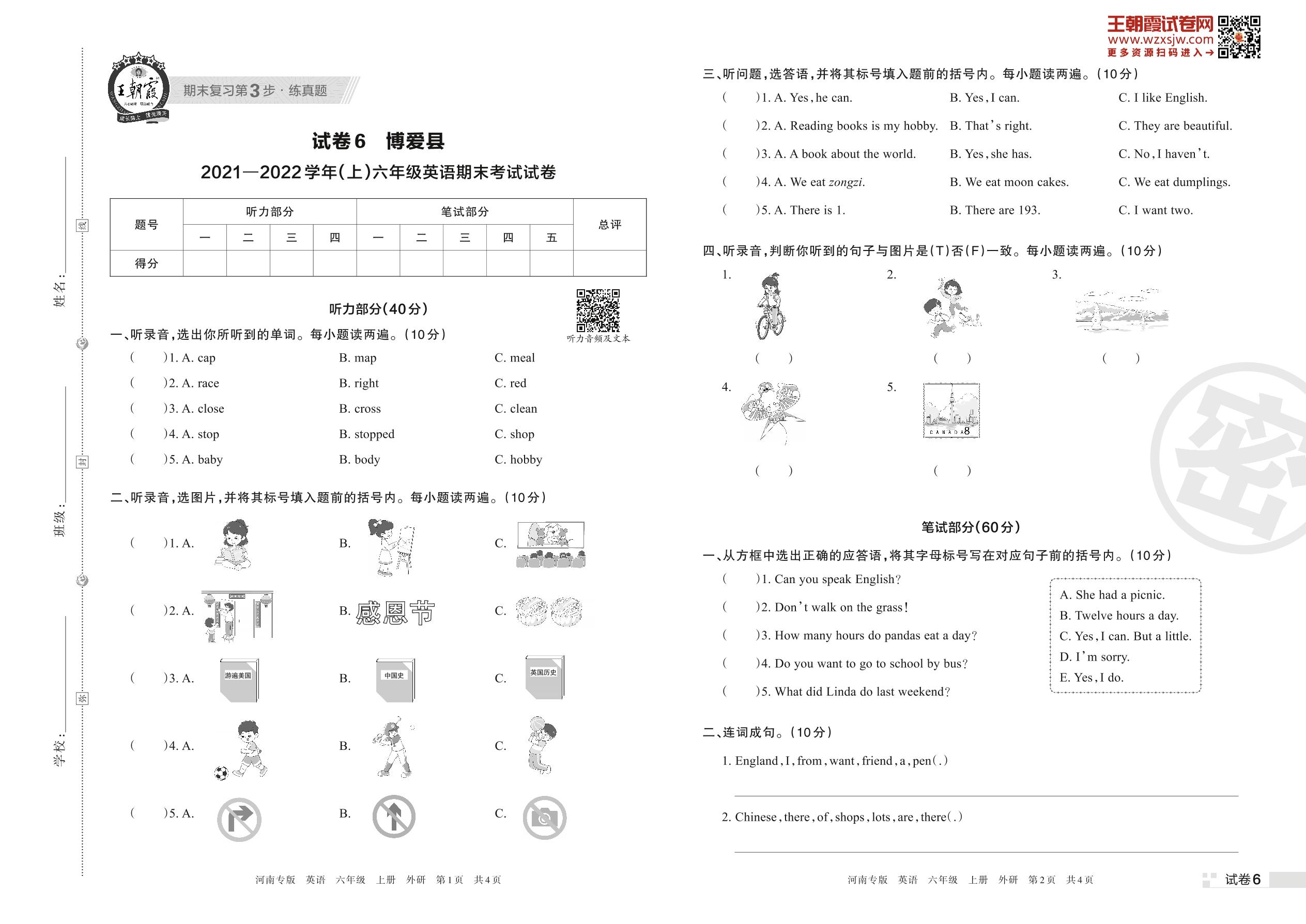 博爱县2021—2022学年(上)六年级英语期末考试试卷(外研版)【6】
