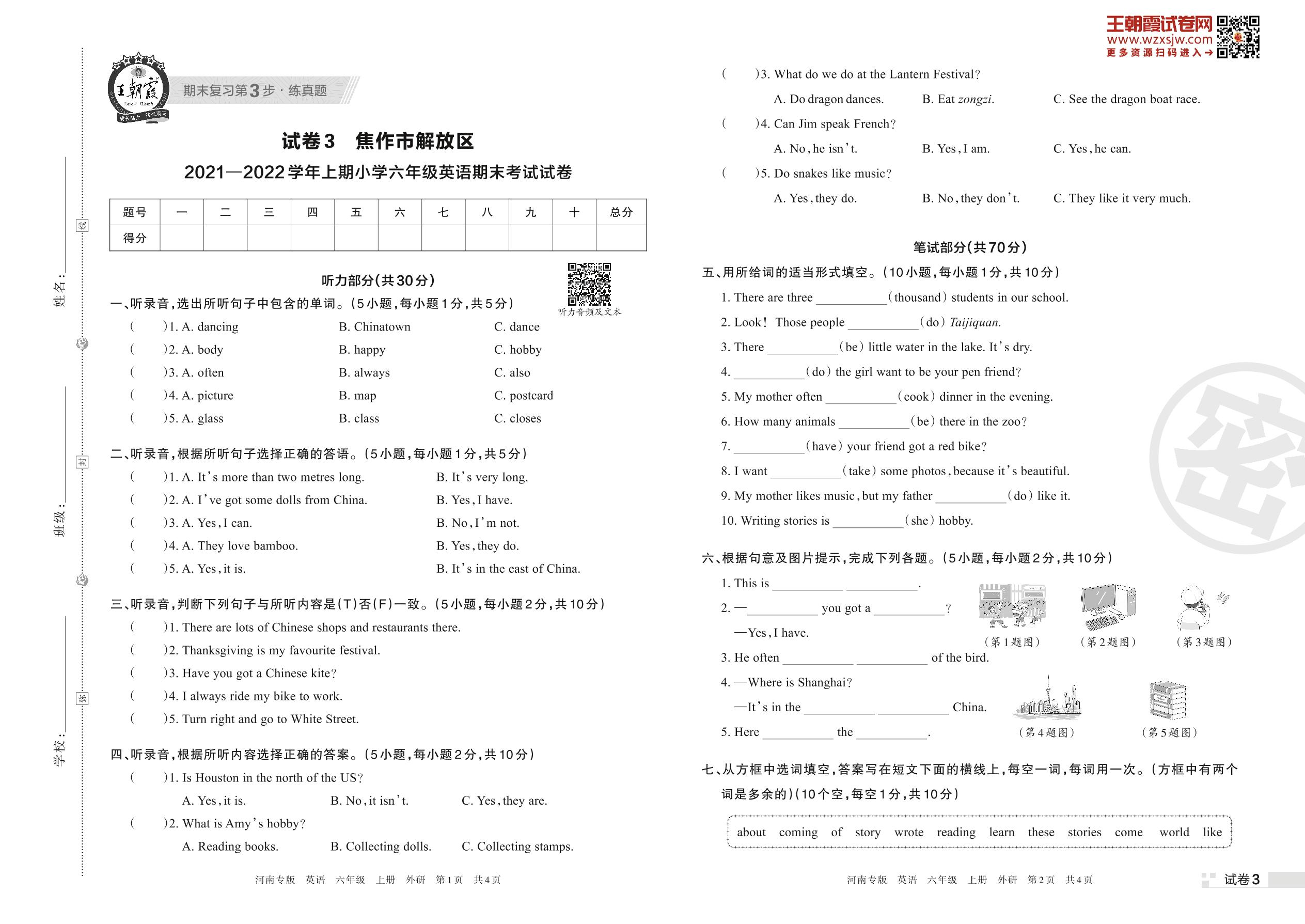 焦作市解放区2021—2022学年上期小学六年级英语期末考试试卷(外研版)【3】