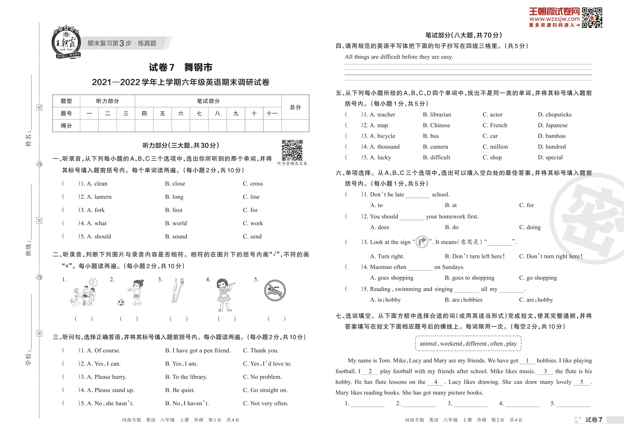 舞钢市2021—2022学年上学期六年级英语期末调研试卷(外研版)【7】