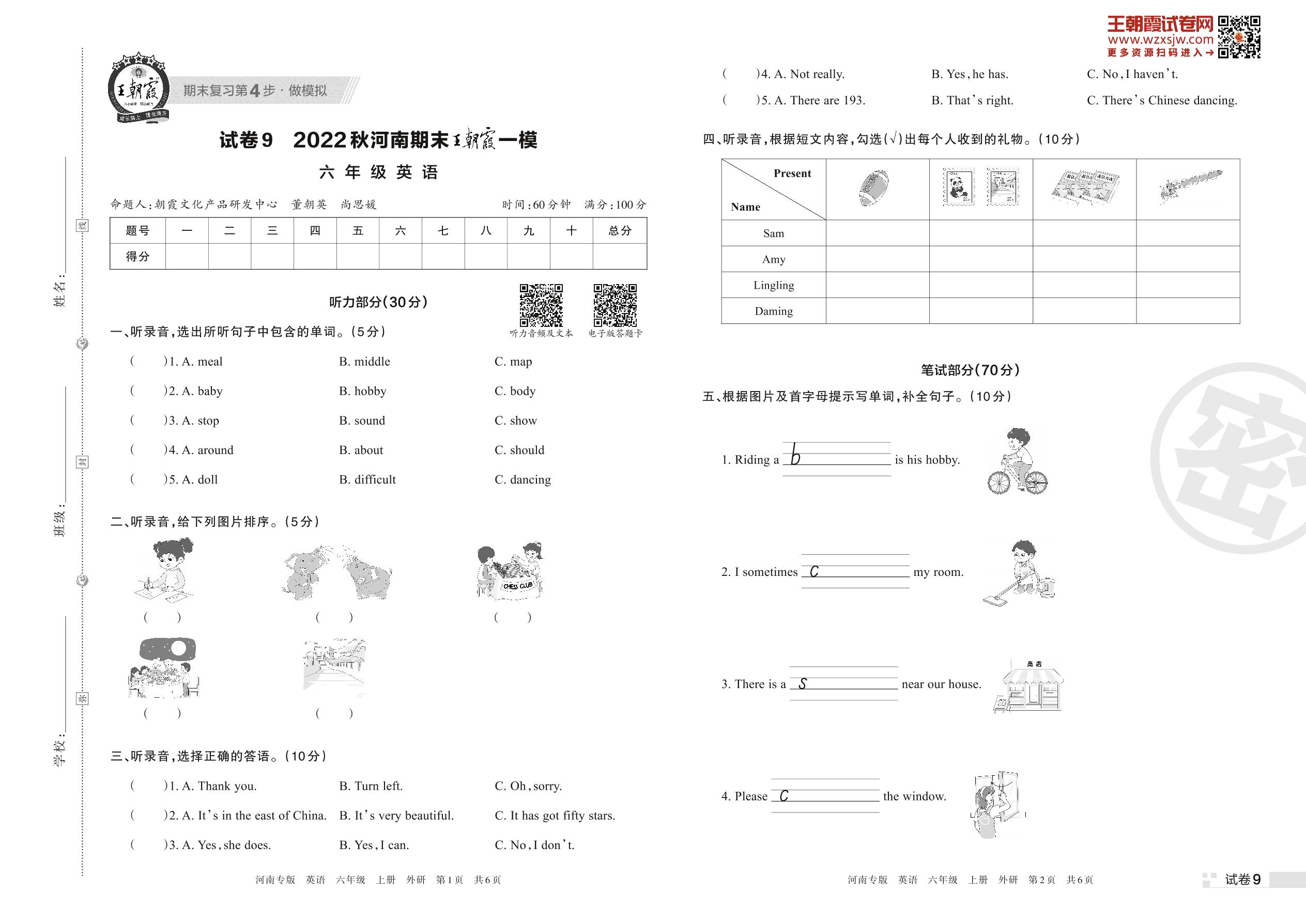 王朝霞期末模拟卷六年级上册英语(外研版)_R221112104112701【9】