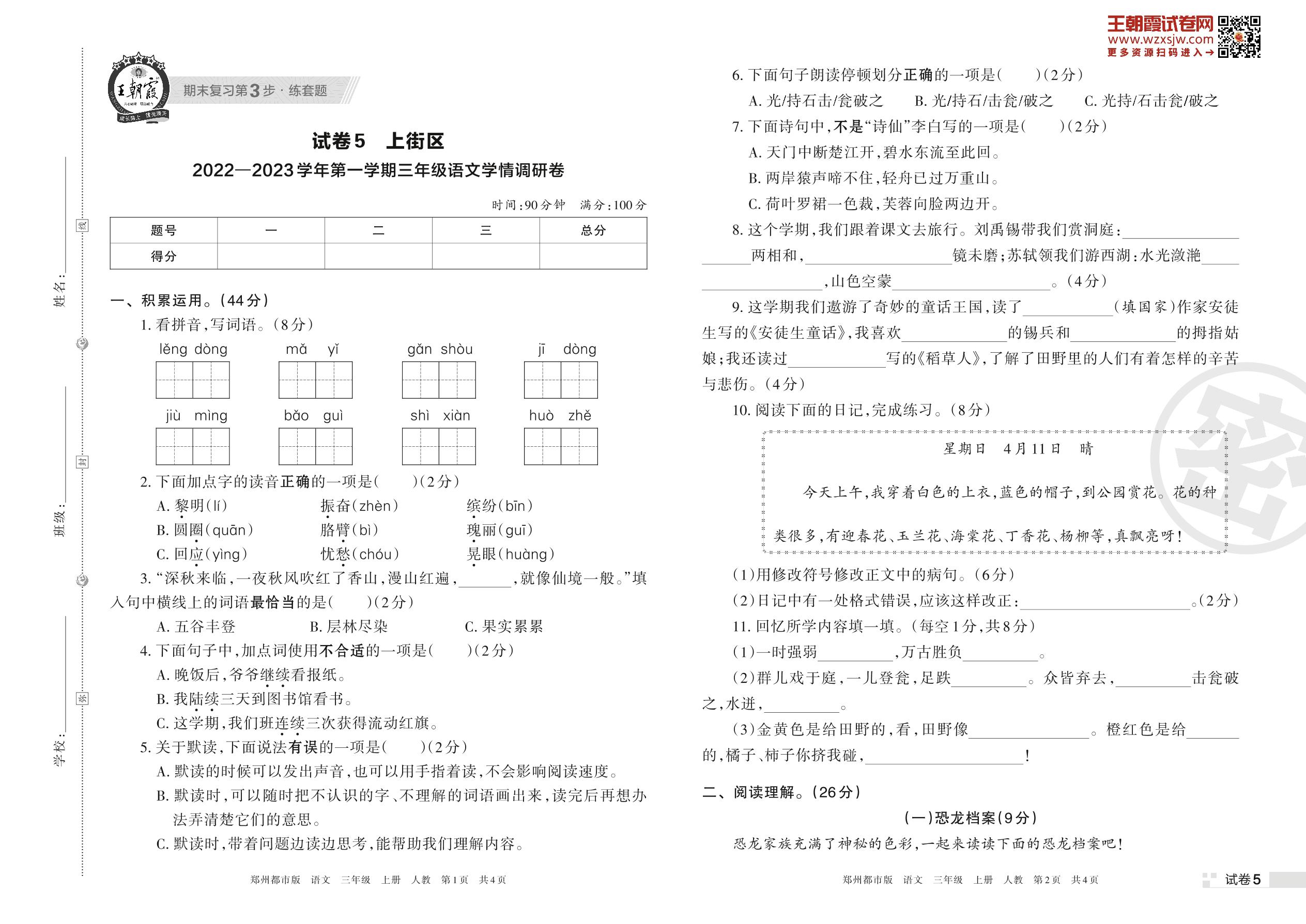 上街区2022—2023学年第一学期三年级语文学情调研卷(人教版)【5】