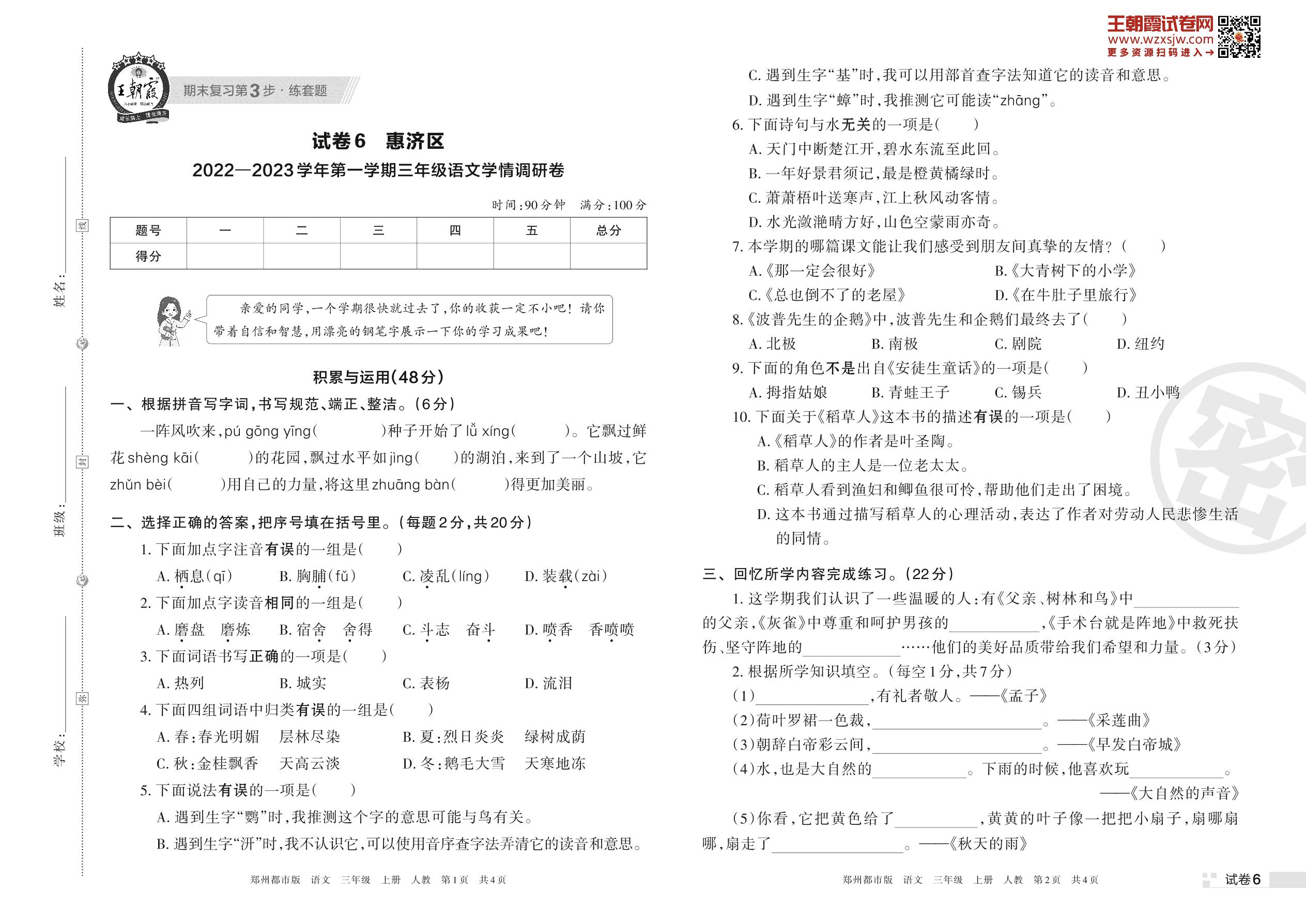 惠济区2022—2023学年第一学期三年级语文学情调研卷(人教版)【6】