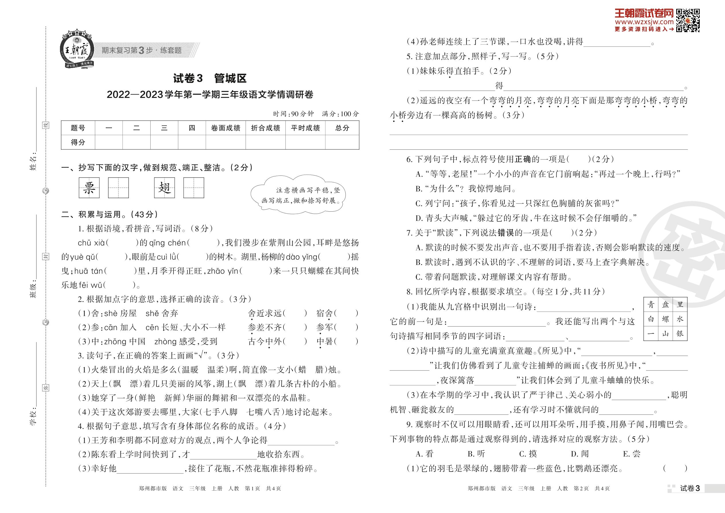 管城区2022—2023学年第一学期三年级语文学情调研卷(人教版)【3】