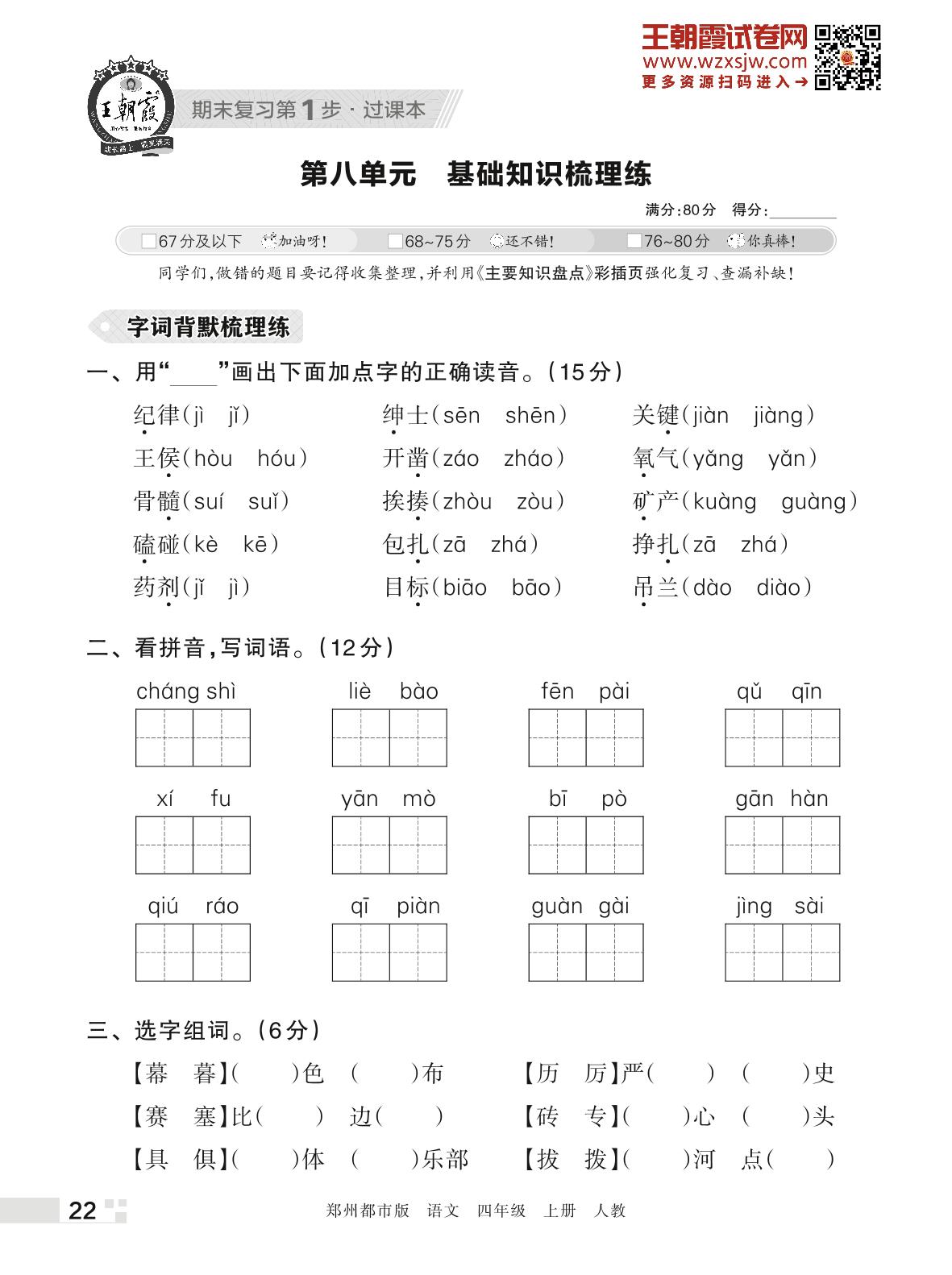 王朝霞期末过课本——第八单元 基础知识梳理练四年级上册语文(人教版)_R221112134925383