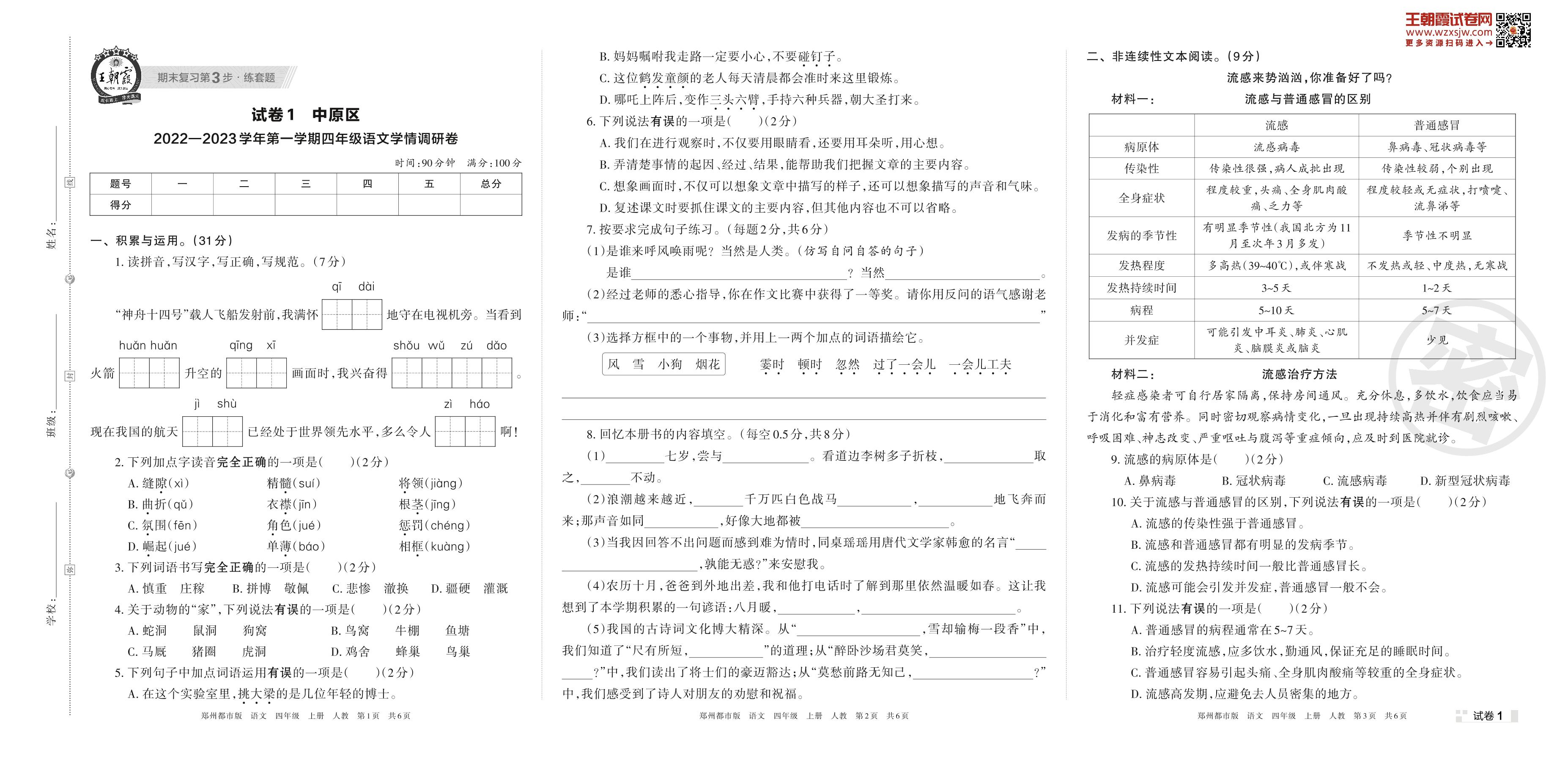 中原区2022—2023学年第一学期四年级语文学情调研卷(人教版)【1】