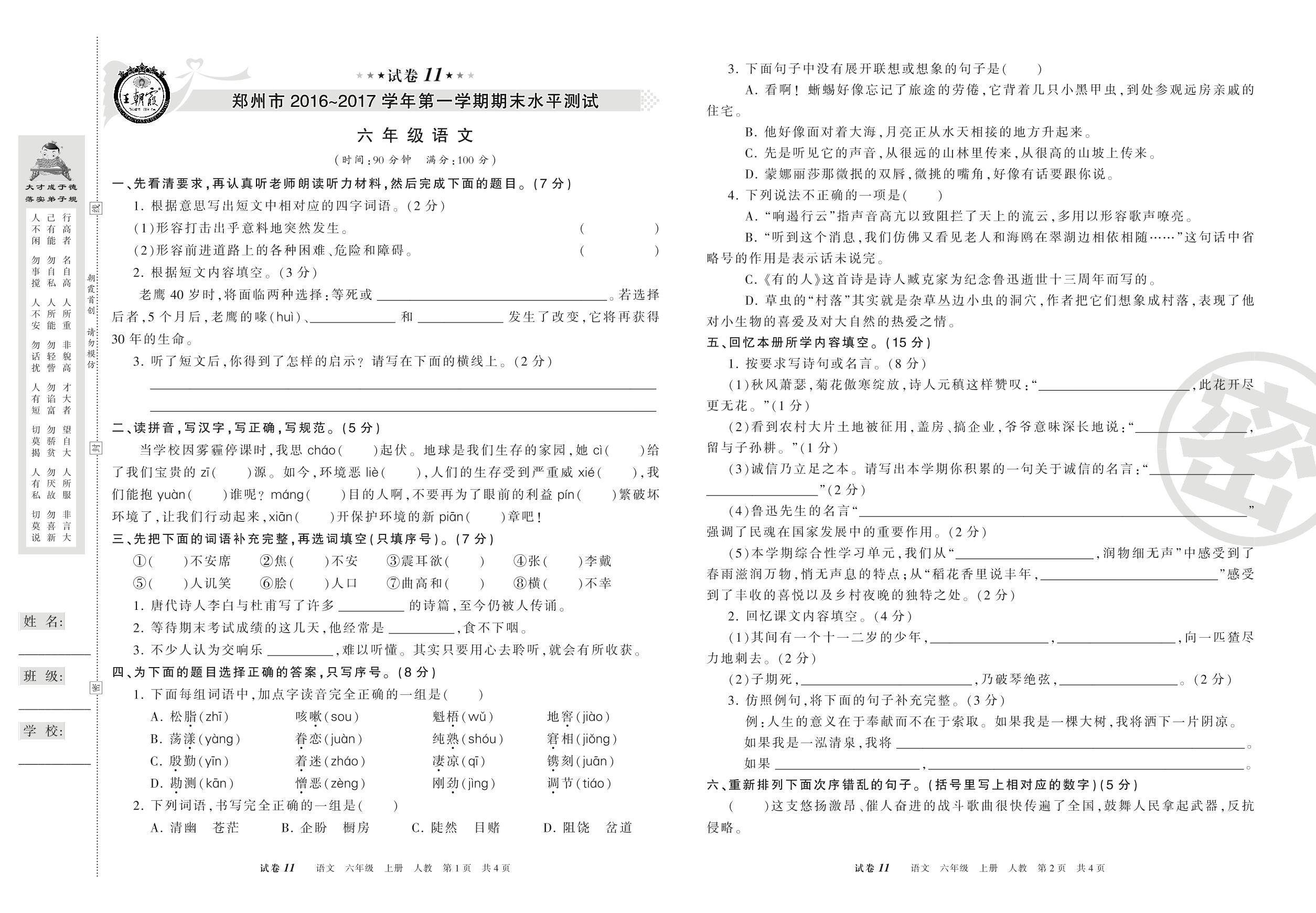 2016-2017学年第一学期郑州市六年级语文试卷(人教版)【11】