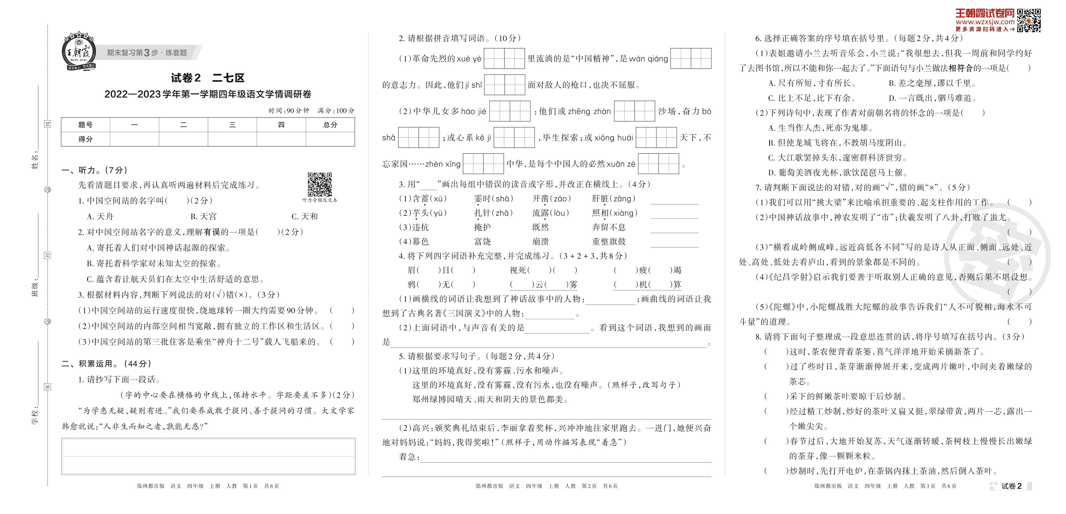 二七区2022—2023学年第一学期四年级语文学情调研卷(人教版)【2】