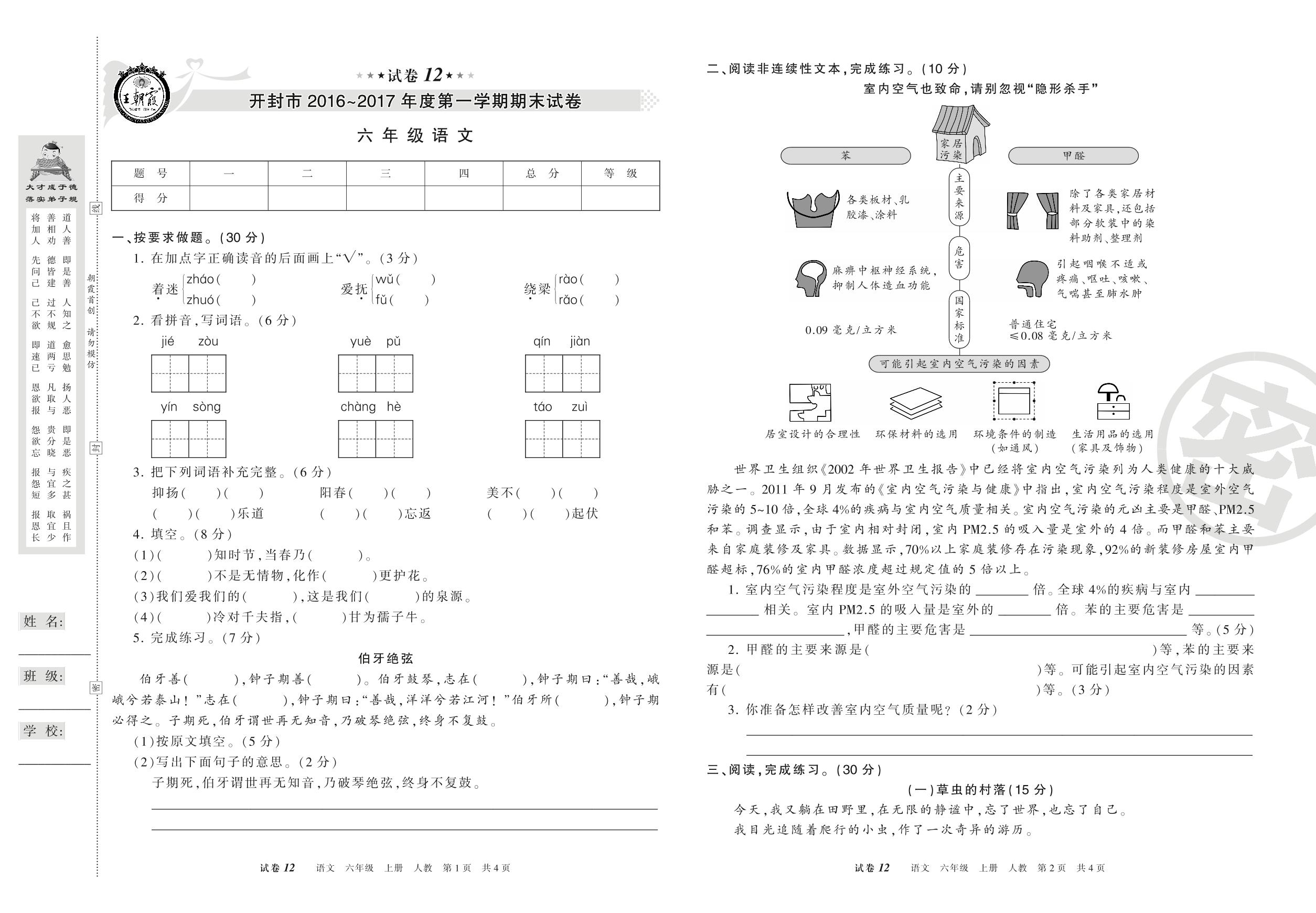 2016-2017学年第一学期开封市六年级语文试卷(人教版)【12】