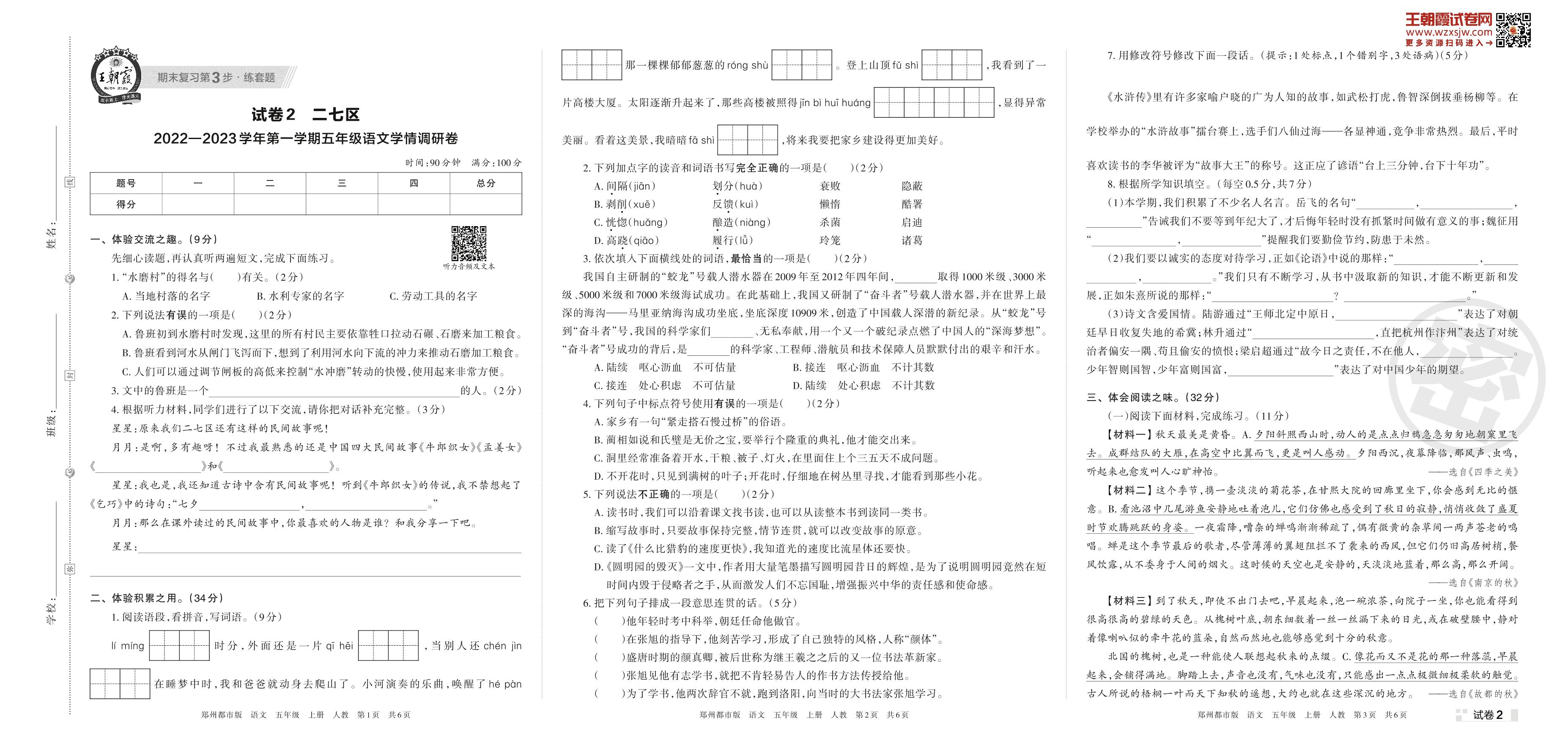 二七区2022—2023学年第一学期五年级语文学情调研卷(人教版)【2】