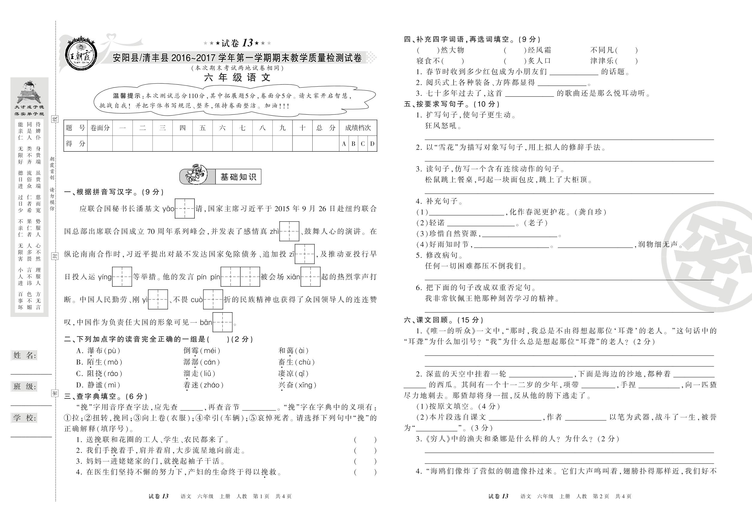 2016-2017学年第一学期安阳市安阳县清丰县六年级语文试卷(人教版)【13】