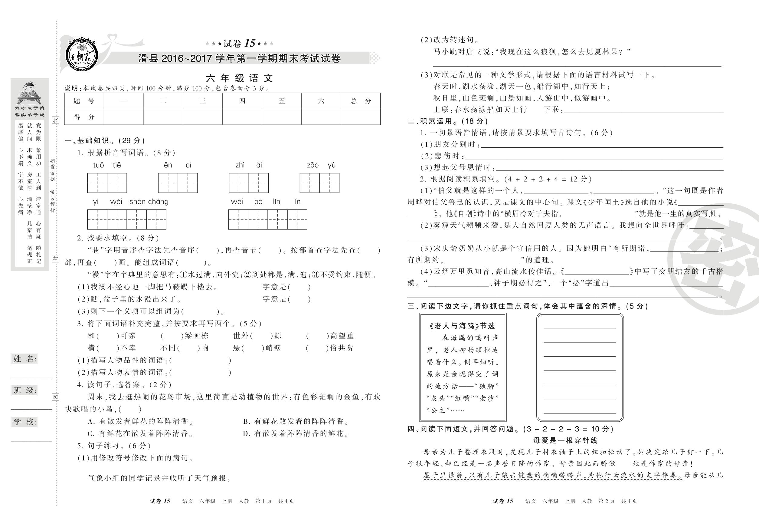 2016-2017学年第一学期安阳市滑县六年级语文试卷(人教版)【15】