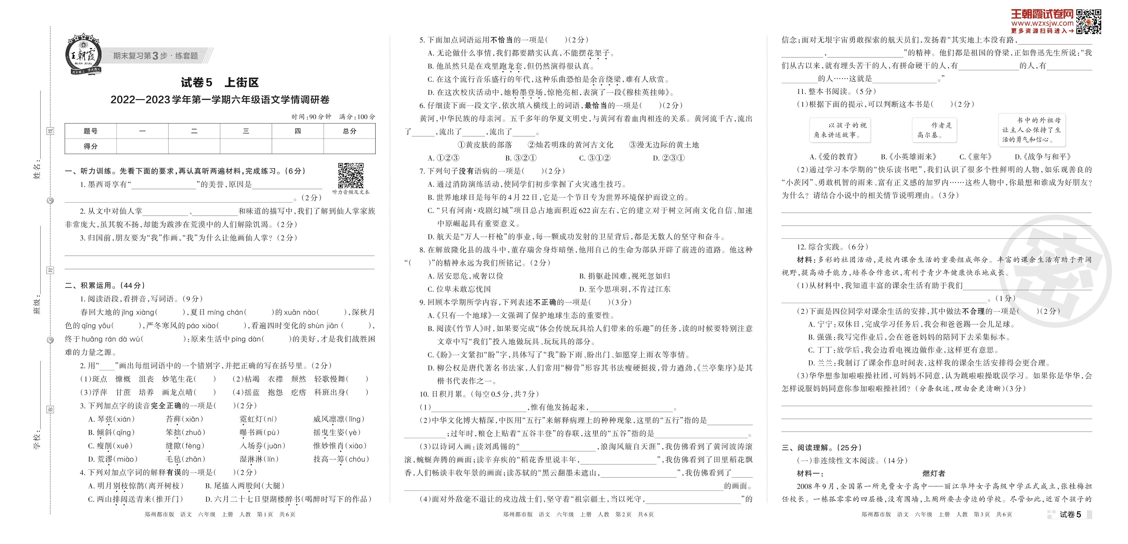 上街区2022—2023学年第一学期六年级语文学情调研卷(人教版)【5】