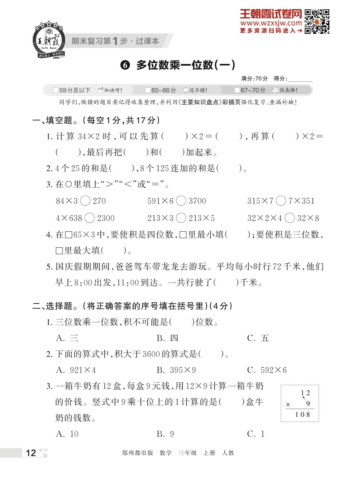 王朝霞期末过课本——6 多位数乘一位数(一)三年级上册数学(人教版)_R221112141019756