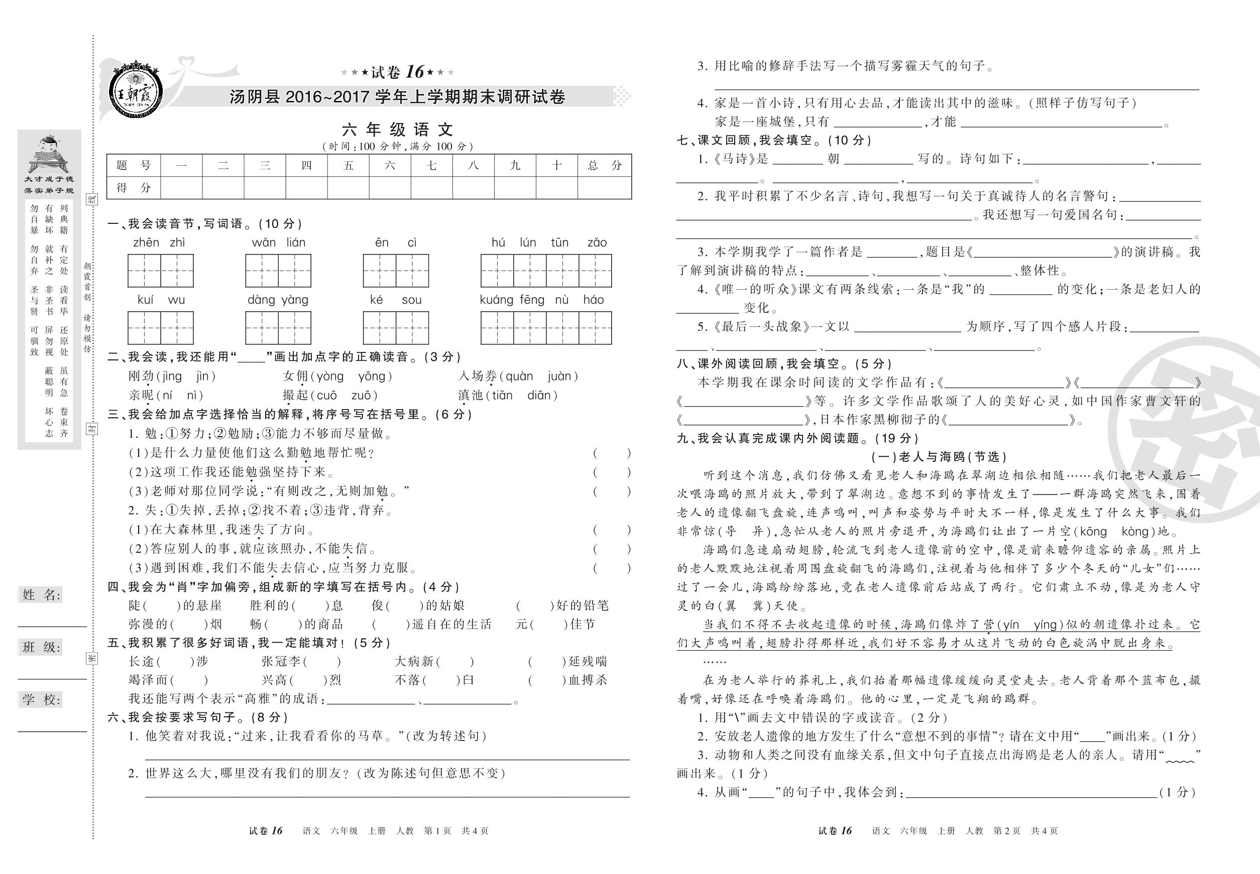 2016-2017学年第一学期安阳市汤阴县六年级语文试卷(人教版)【16】