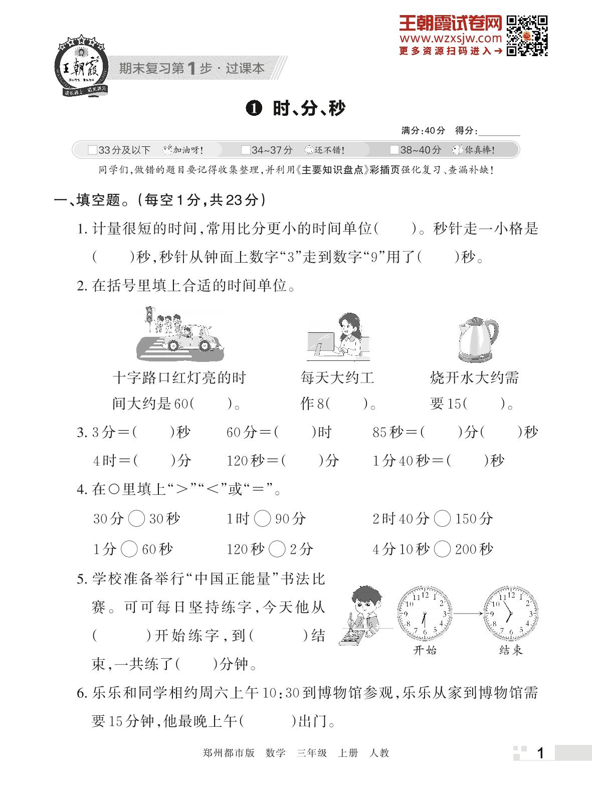 王朝霞期末过课本——1 时、分、秒三年级上册数学(人教版)_R221112141020794