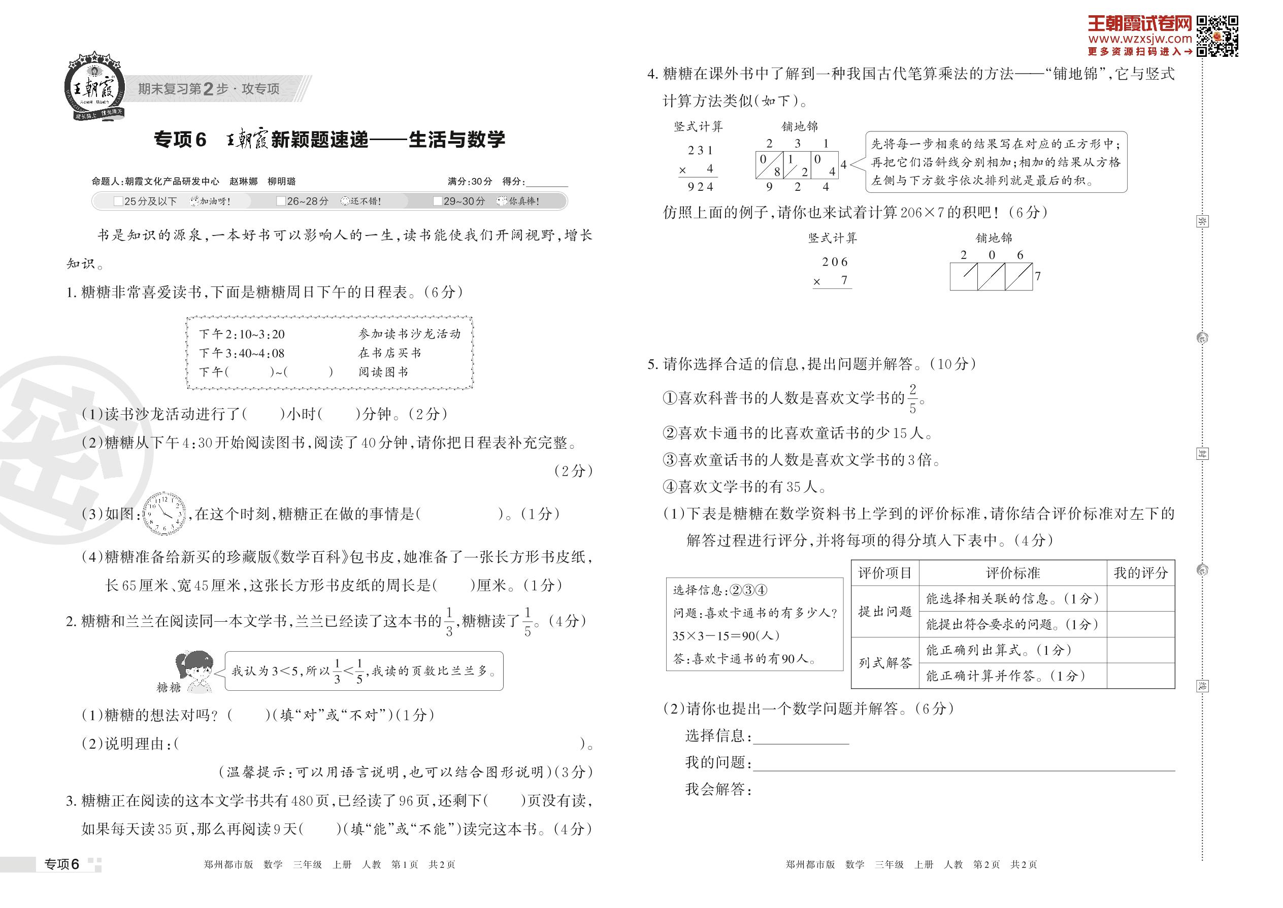 王朝霞期末专项卷——王朝霞新颖题速递:生活与数学三年级上册数学(人教版)_R221112141020303【6】