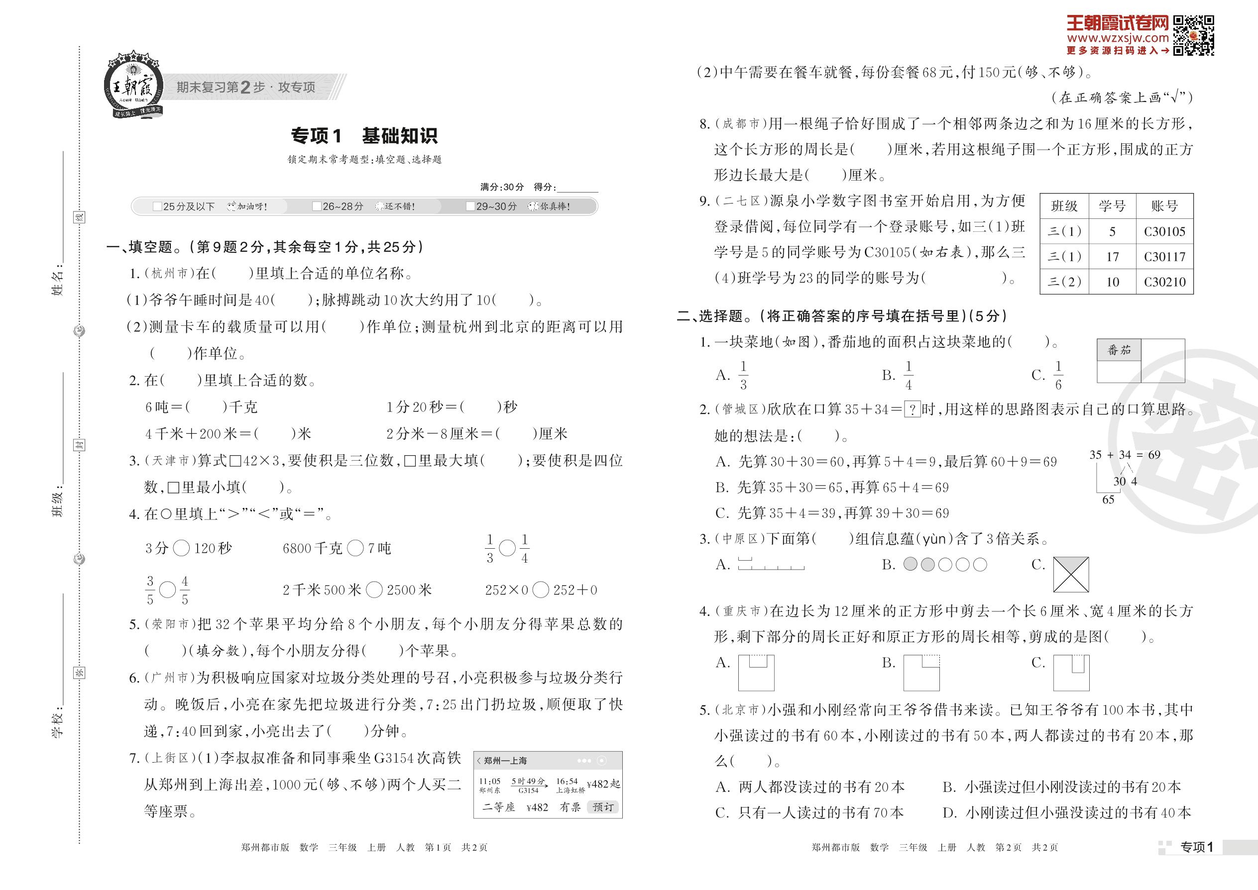 王朝霞期末专项卷——基础知识三年级上册数学(人教版)_R221112141021072【1】