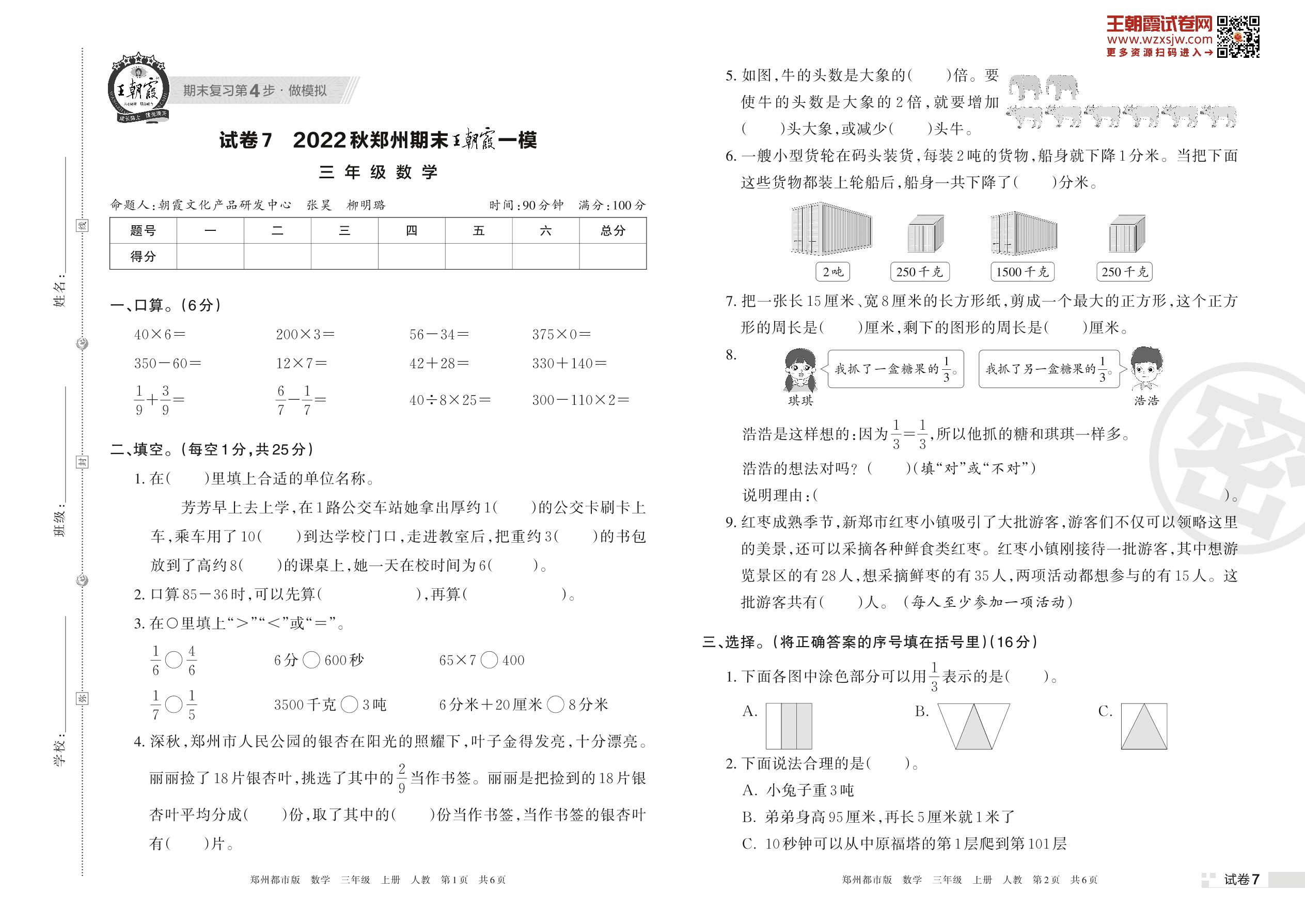 王朝霞期末模拟卷三年级上册数学(人教版)_R221112141022767【7】