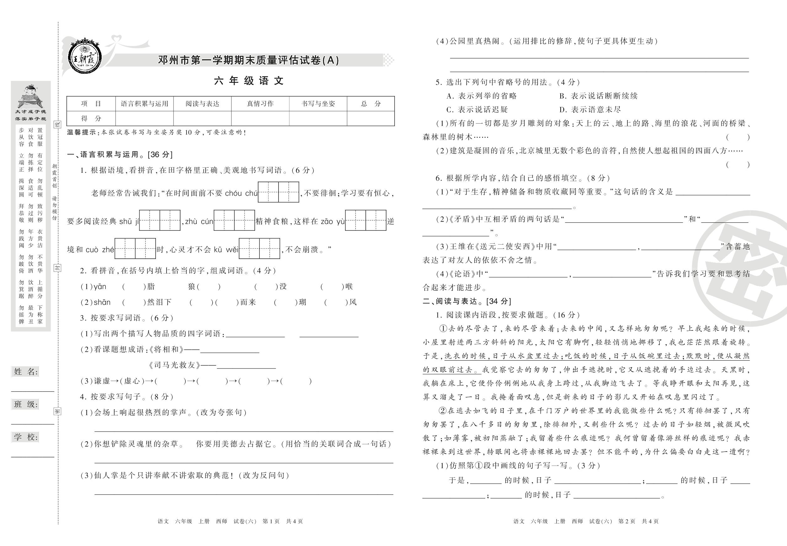 2016-2017学年第一学期邓州市六年级语文试卷(西师版)【6】