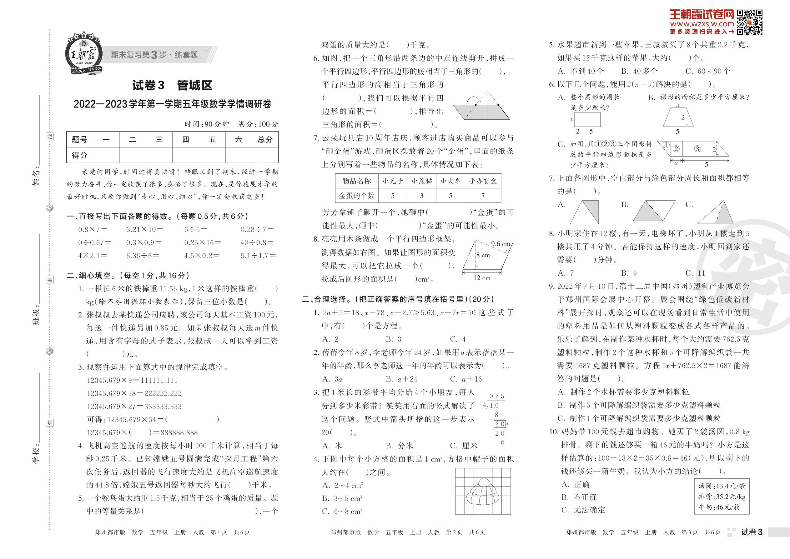 管城区2022—2023学年第一学期五年级数学学情调研卷(人教版)【3】