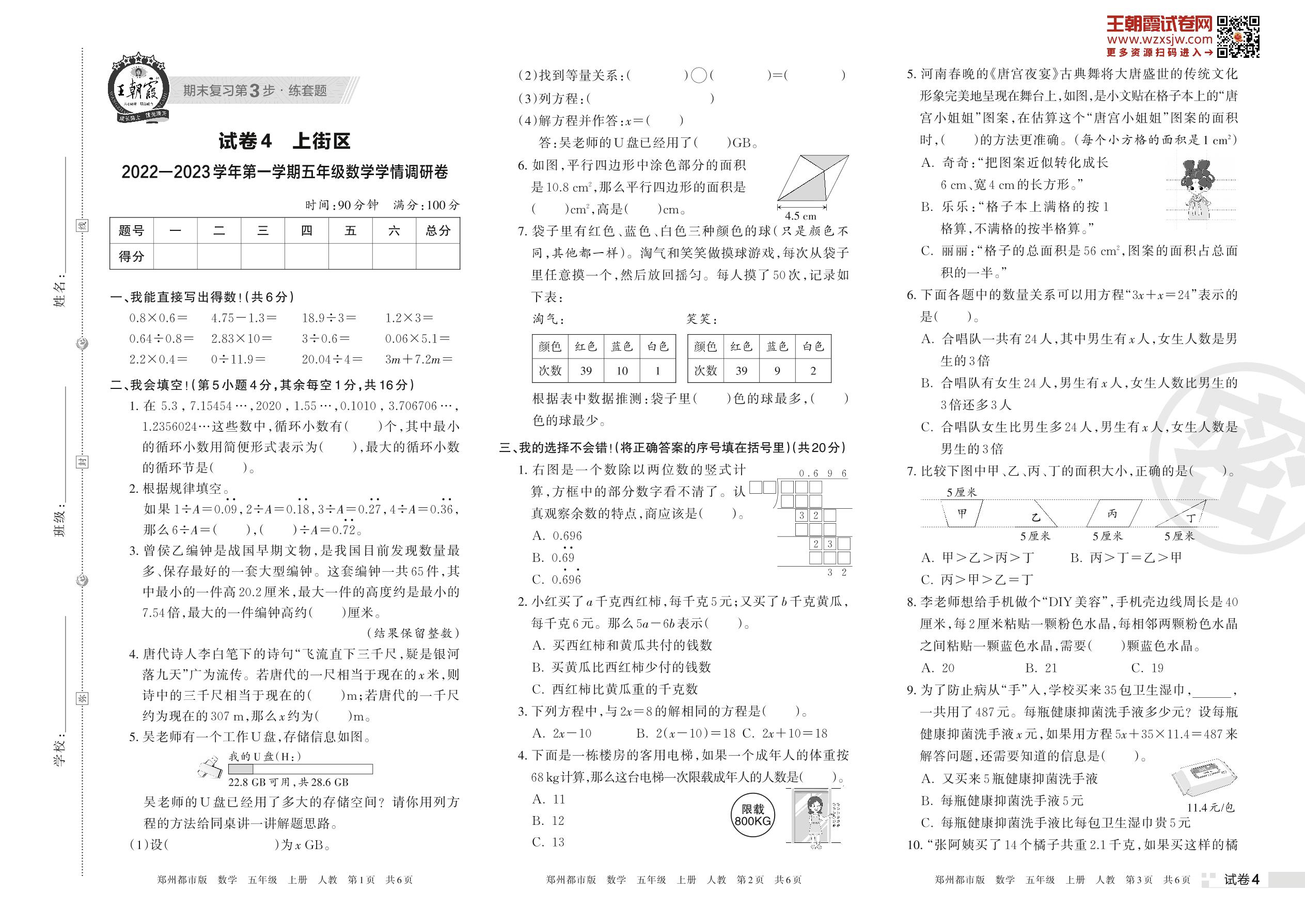 上街区2022—2023学年第一学期五年级数学学情调研卷(人教版)【4】
