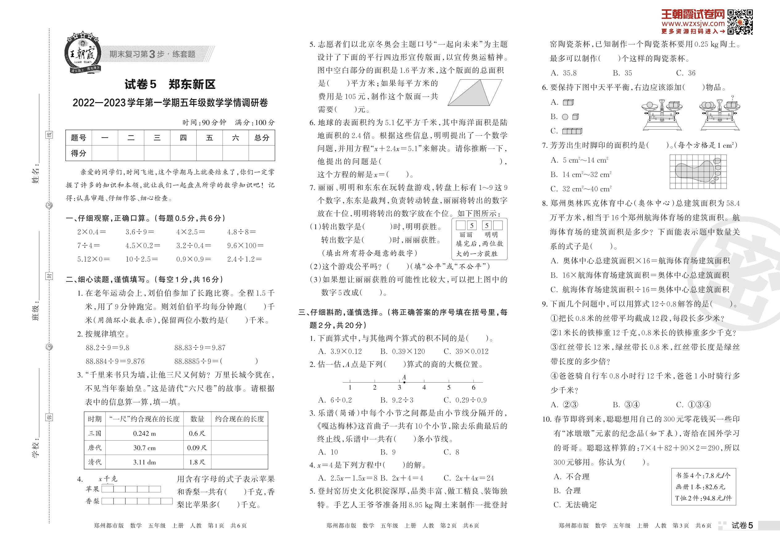 郑东新区2022—2023学年第一学期五年级数学学情调研卷(人教版)【5】