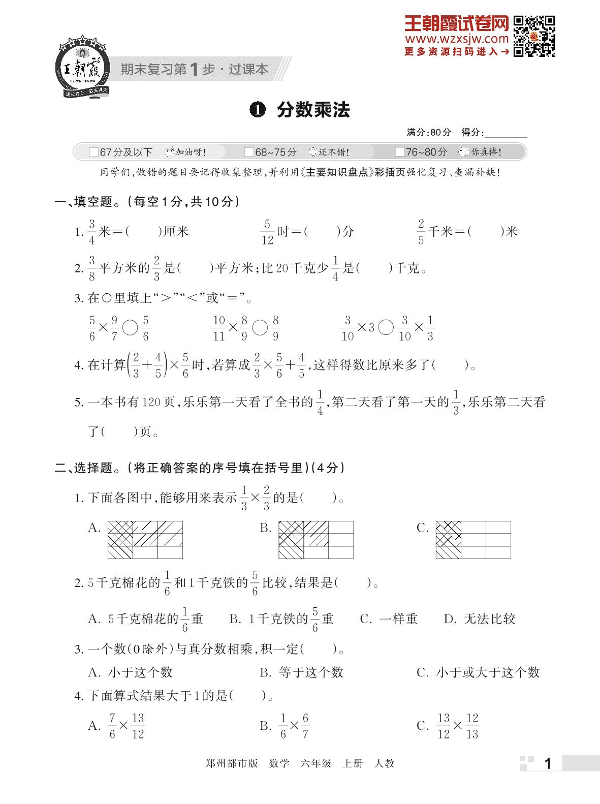 王朝霞期末过课本——1 分数乘法六年级上册数学(人教版)_R221112142949700