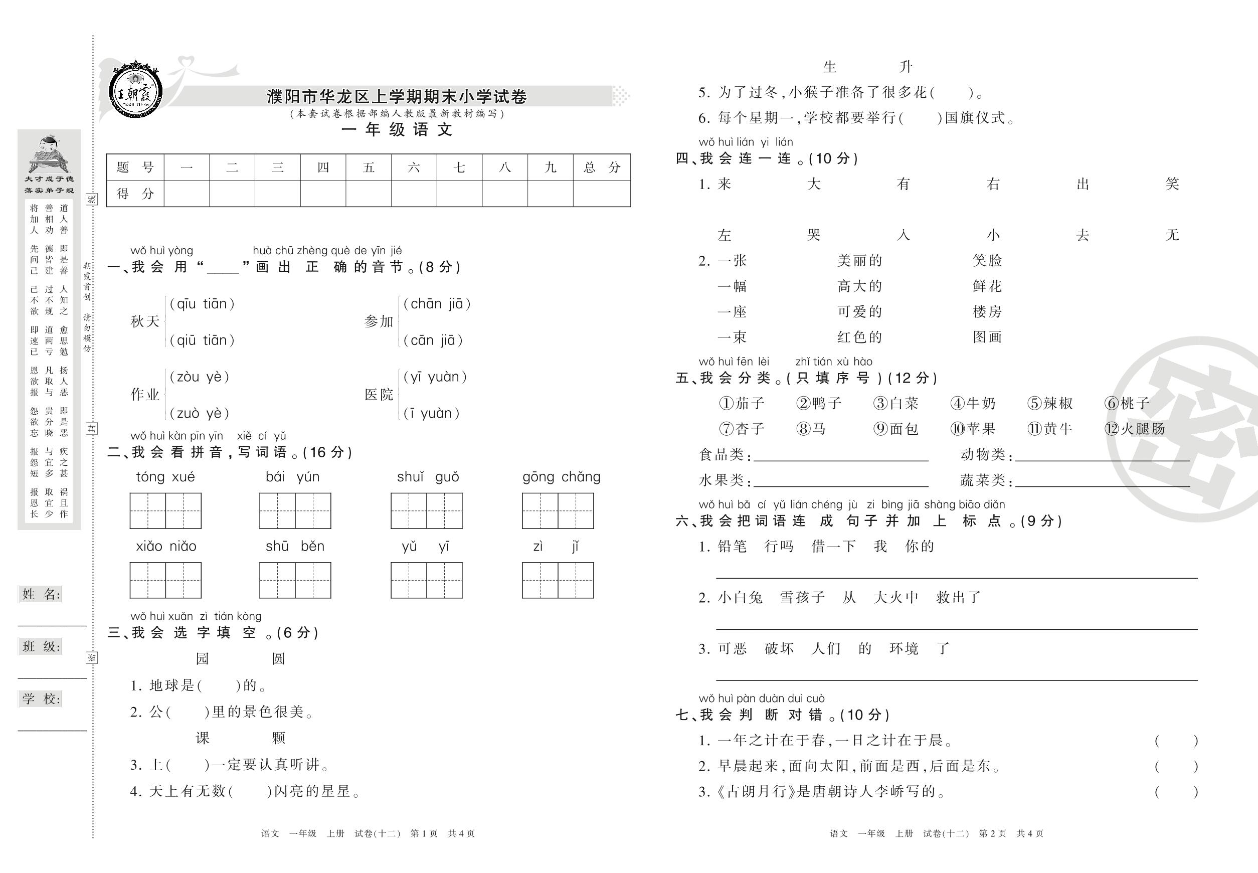 2016-2017学年第一学期濮阳市华龙区一年级语文试卷(人教版)【12】