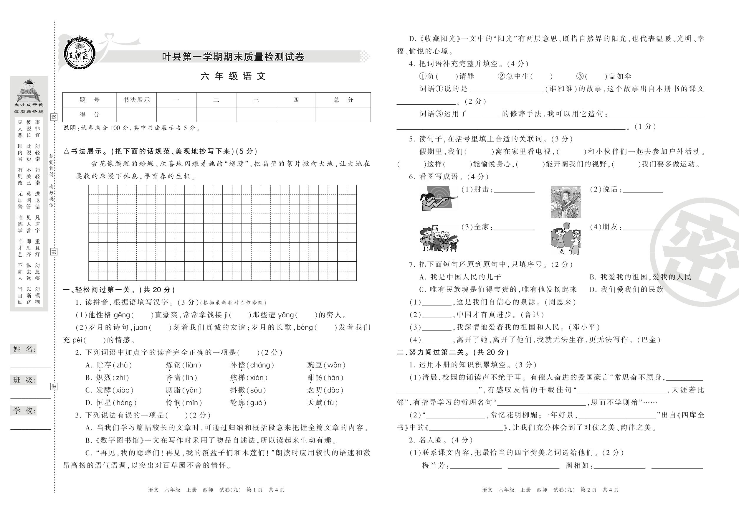 2016-2017学年第一学期平顶山市叶县六年级语文试卷(西师版)【9】
