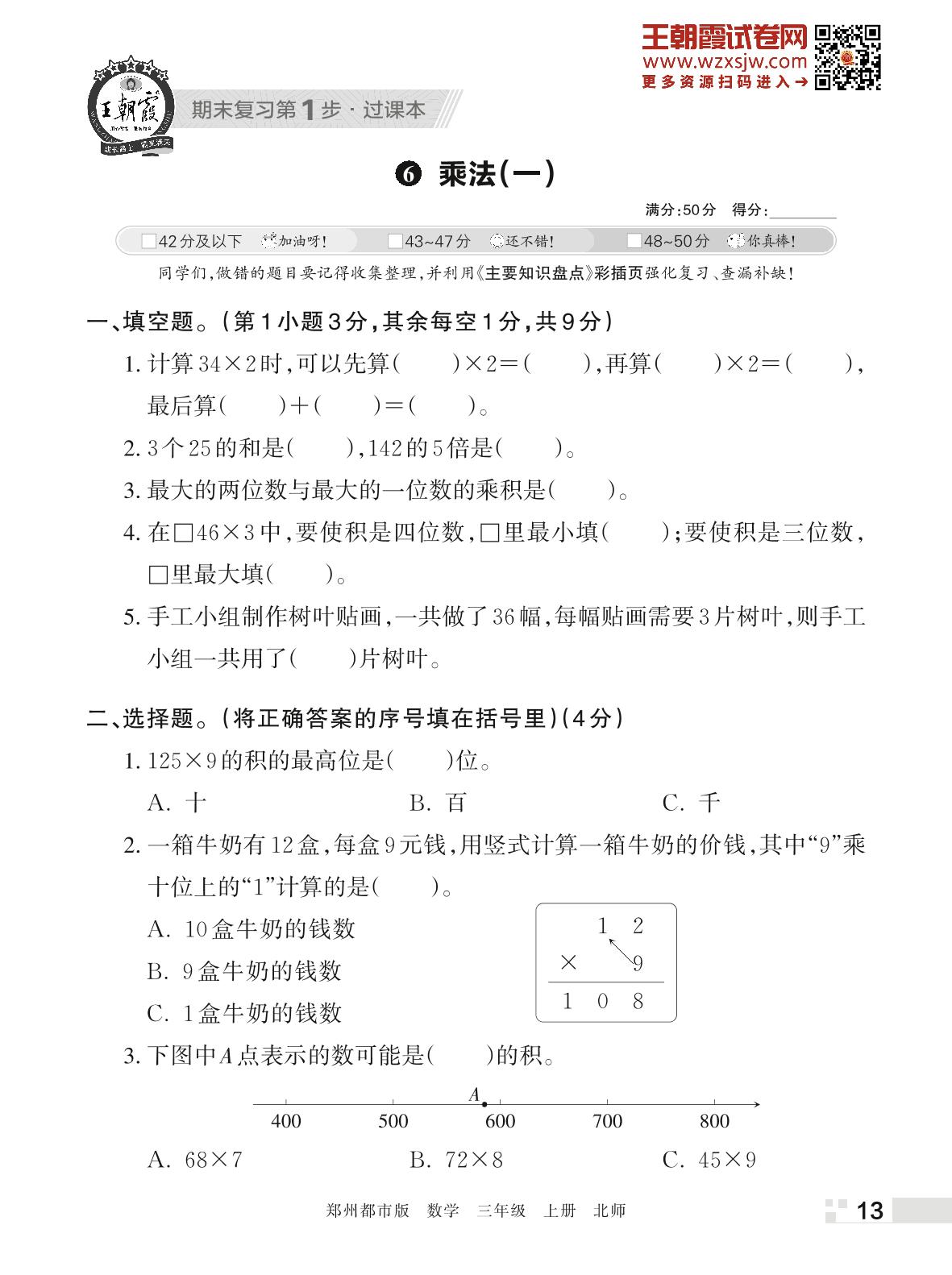 王朝霞期末过课本——6 乘法(一)三年级上册数学(北师版)_R221112143754387