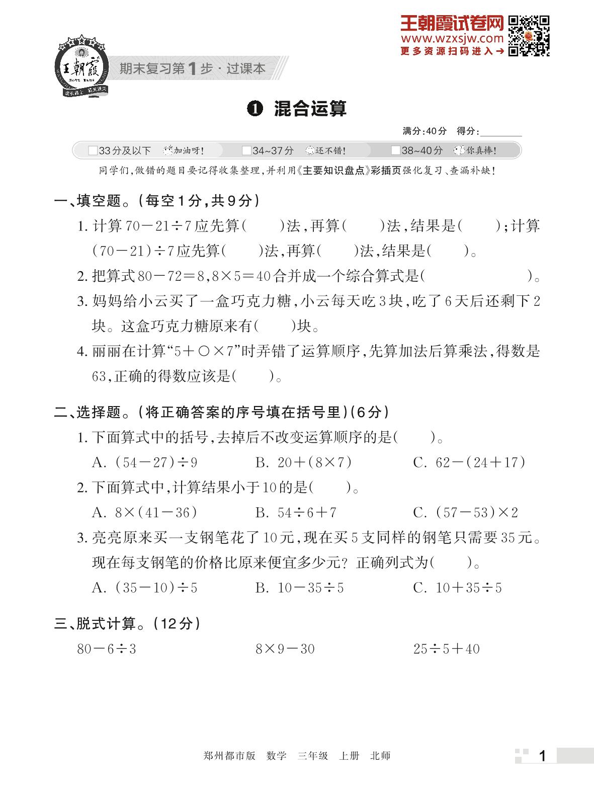 王朝霞期末过课本——1 混合运算三年级上册数学(北师版)_R221112143755025