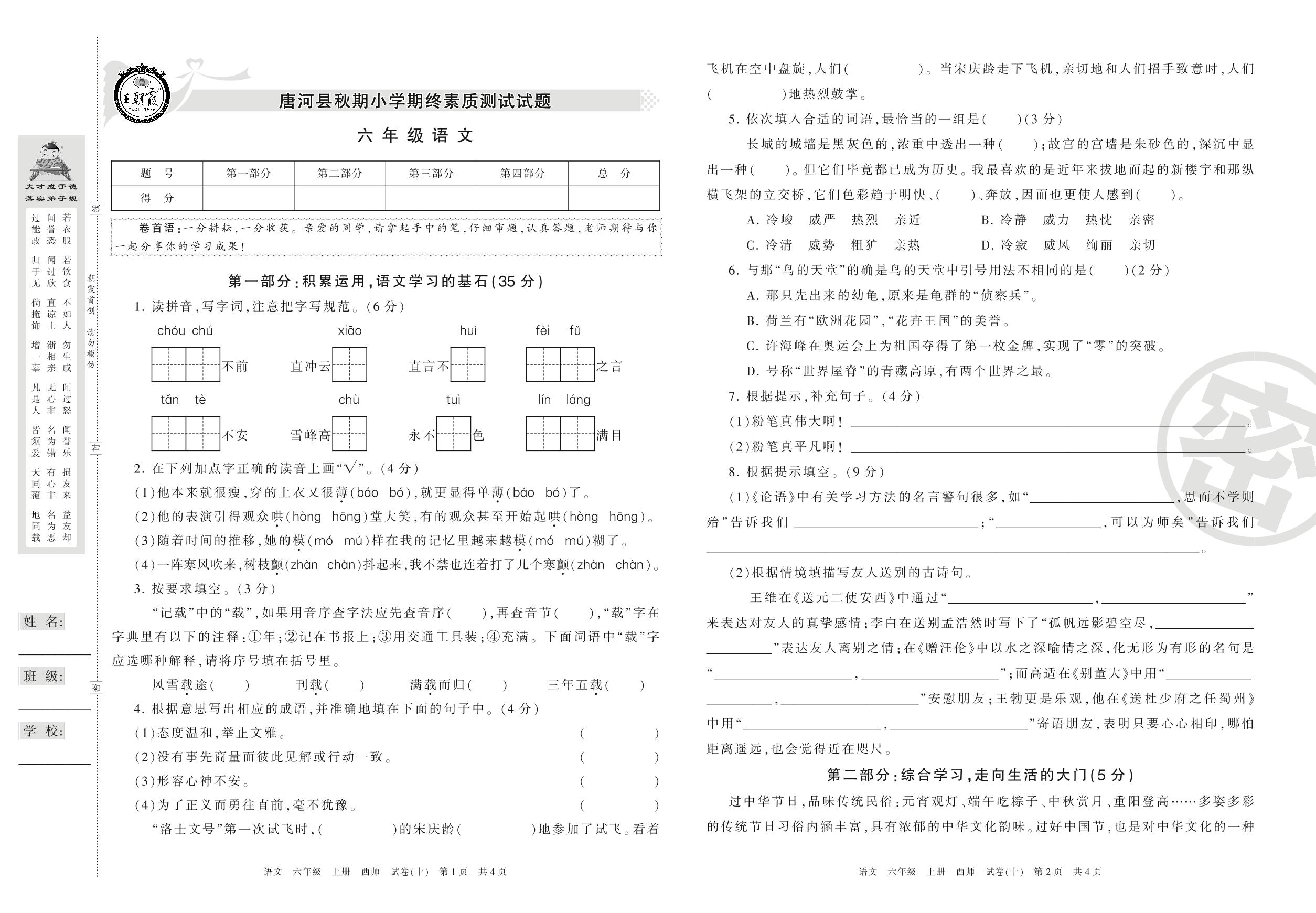 六年级语文西师版上册期末卷