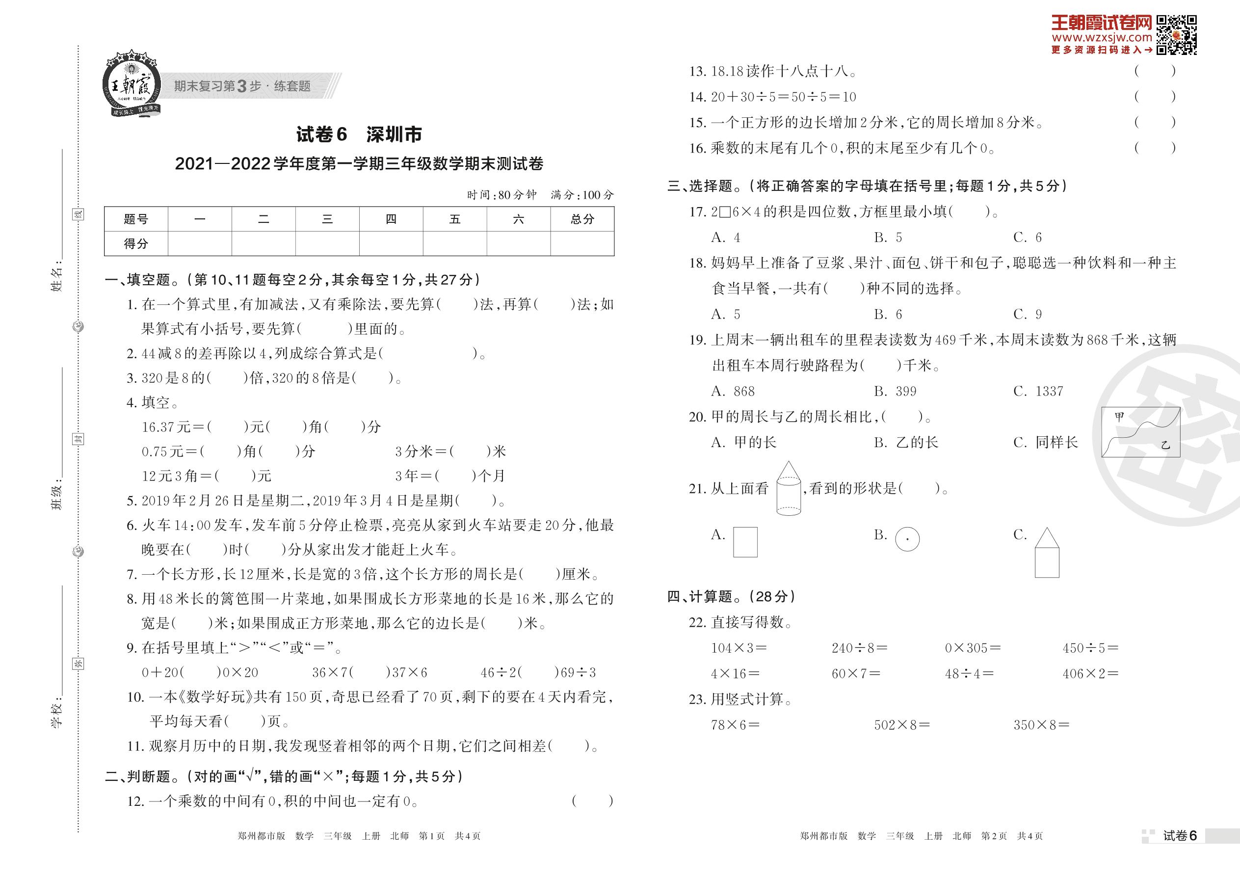 深圳市2021—2022学年第一学期小学三年级数学质量检测用卷(北师版)【6】