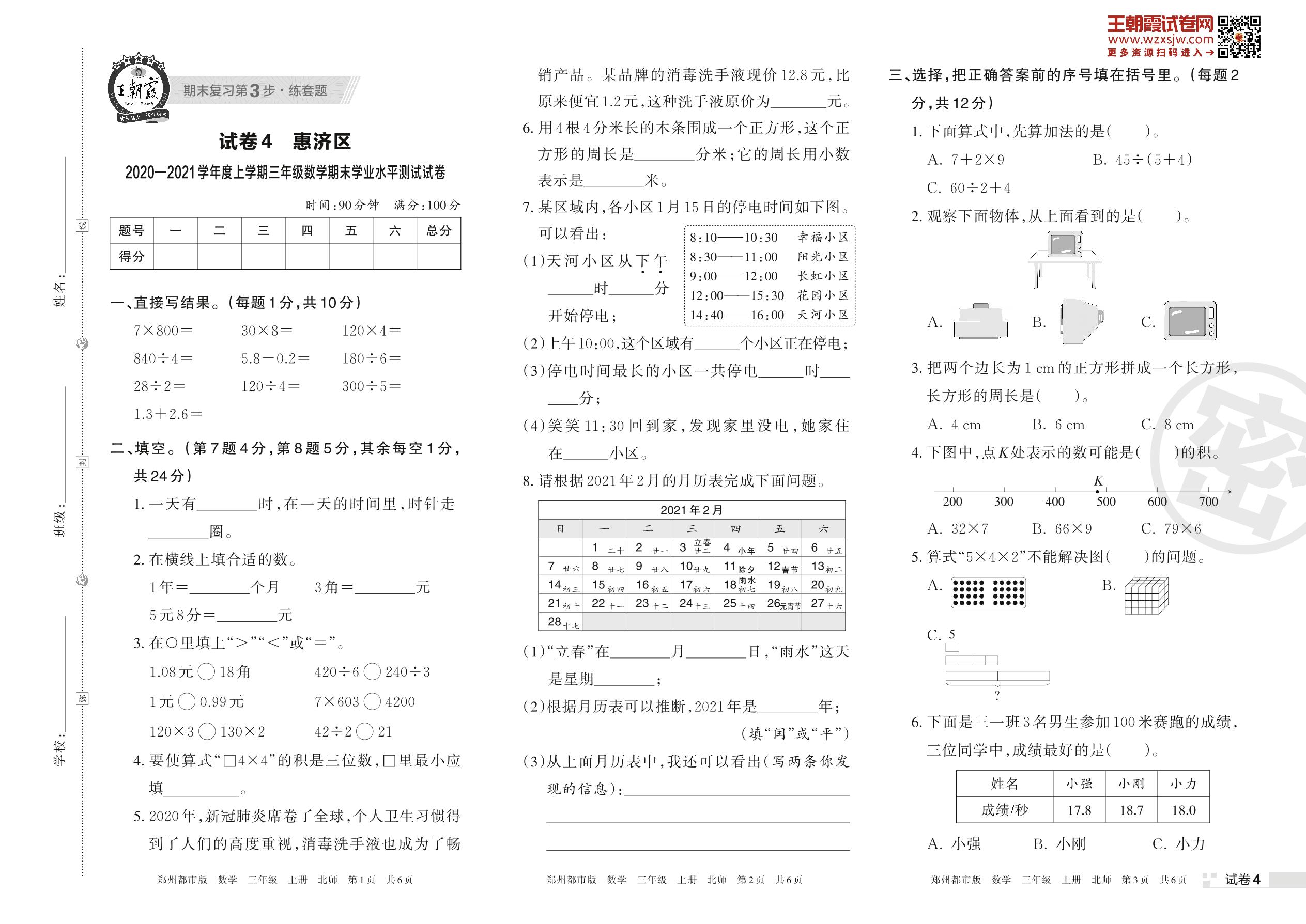 惠济区2020—2021学年度上学期三年级数学期末学业水平测试试卷(北师版)【4】