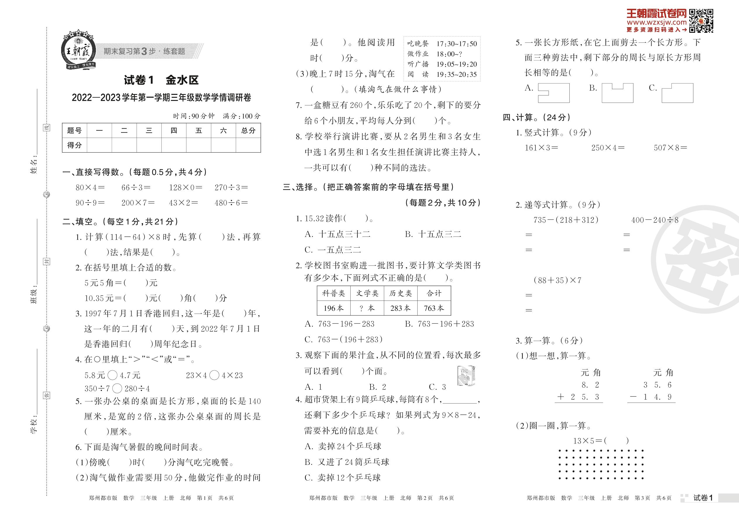 金水区2022—2023学年第一学期三年级数学学情调研卷(北师版)【1】