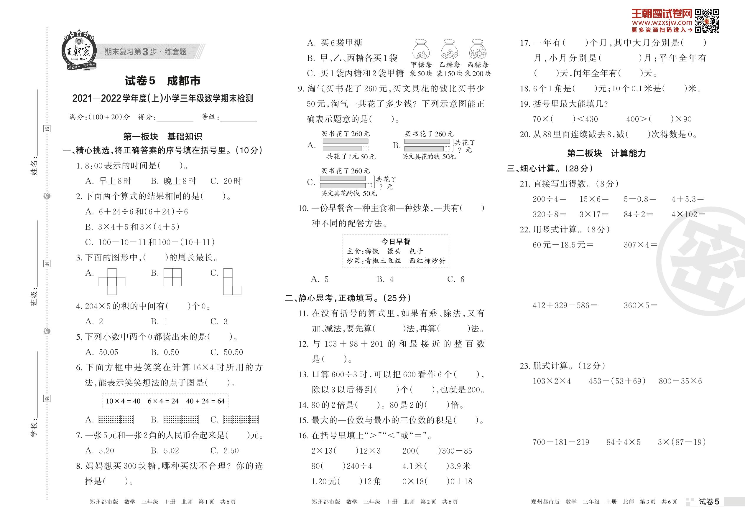 成都市2021—2022学年度(上)小学三年级数学期末检测(北师版)【5】