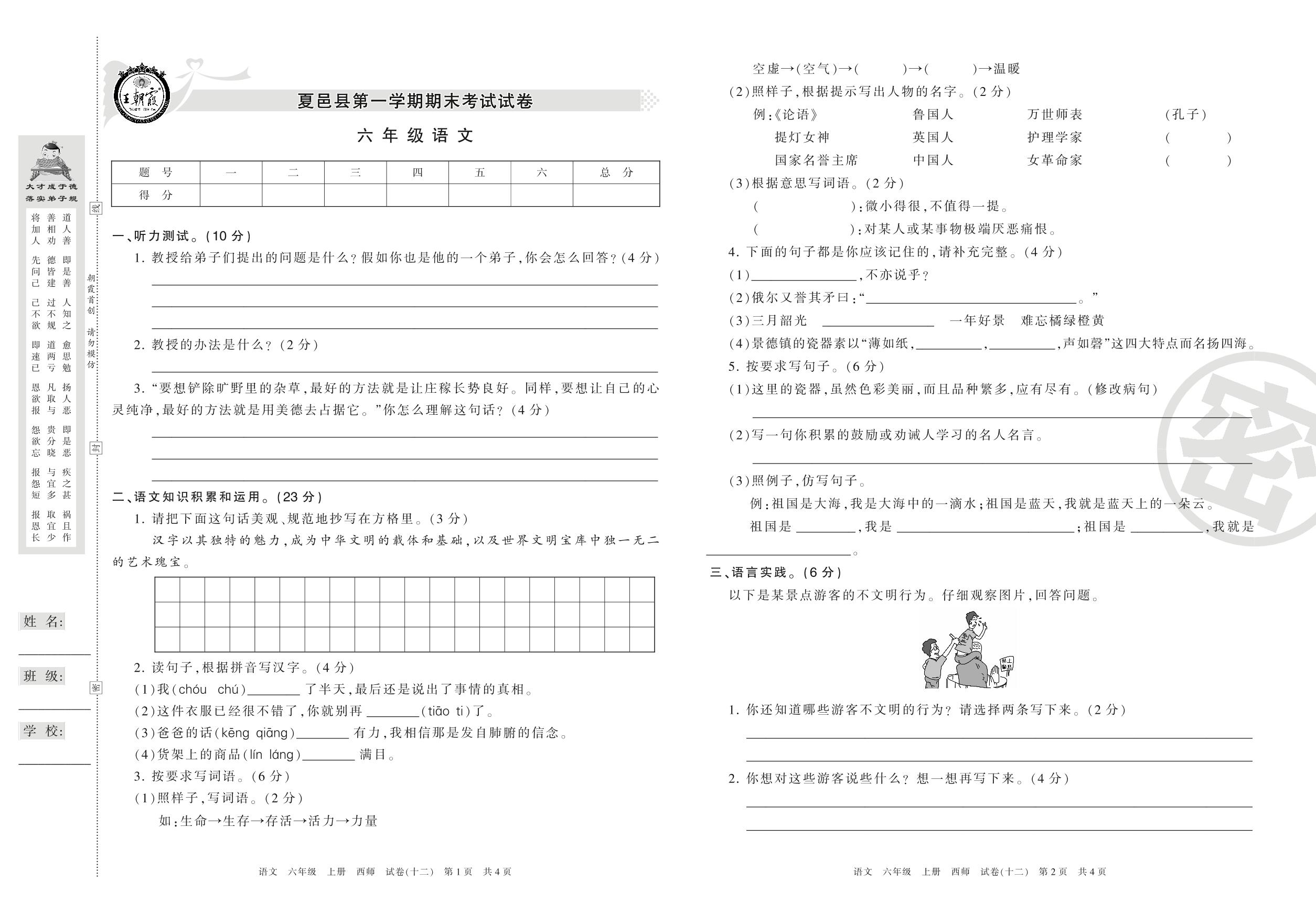 2016-2017学年第一学期商丘市夏邑县六年级语文试卷(西师版)【12】
