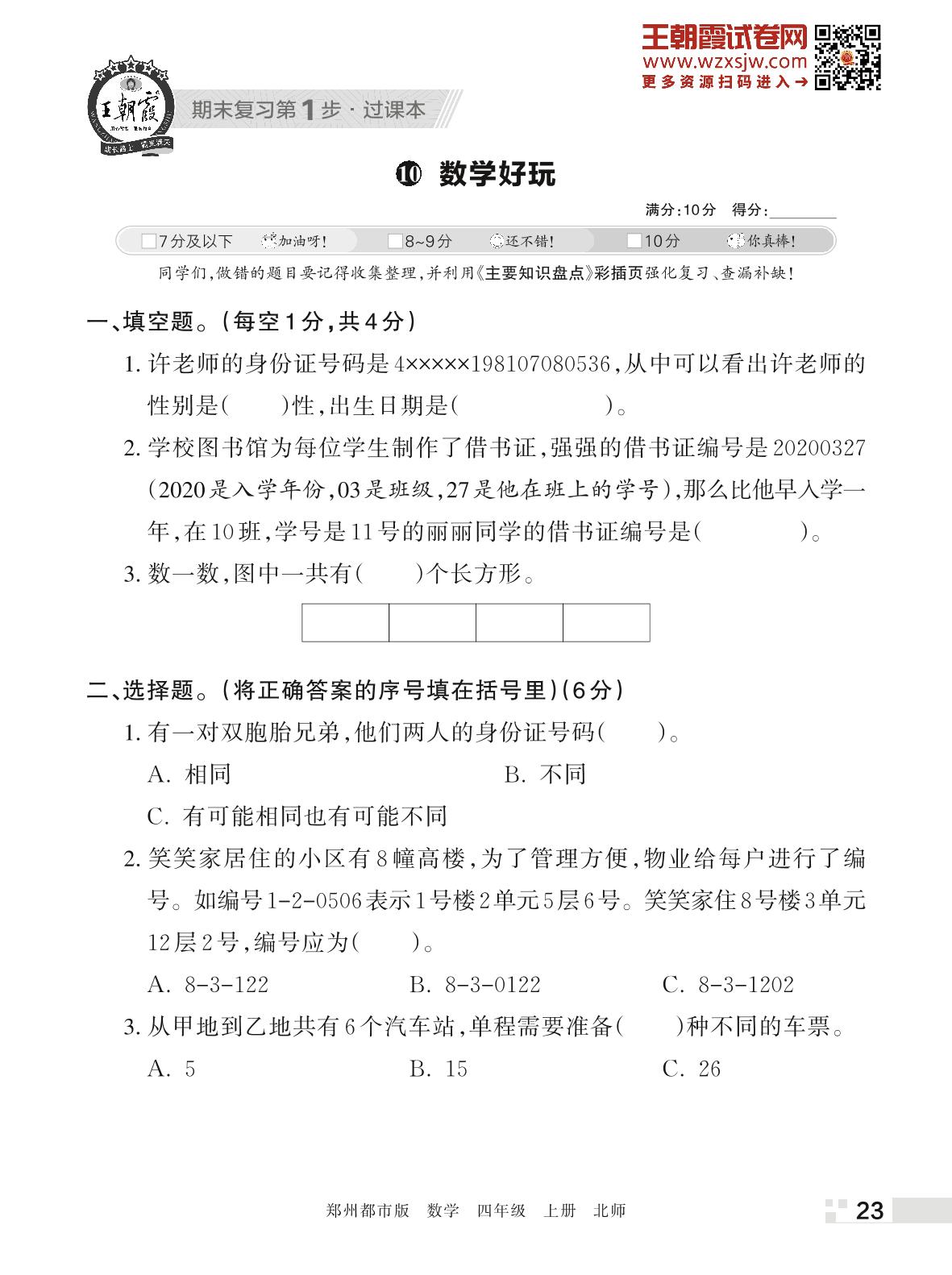 王朝霞期末过课本——10 数学好玩四年级上册数学(北师版)_R221112144741838