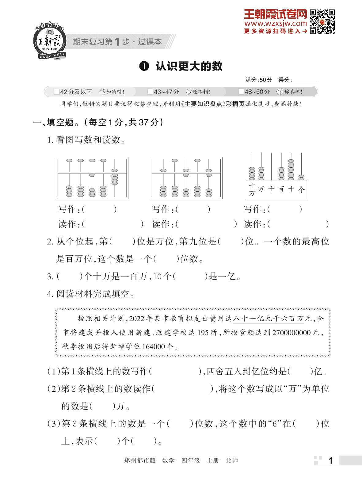 王朝霞期末过课本——1 认识更大的数四年级上册数学(北师版)_R221112144741403