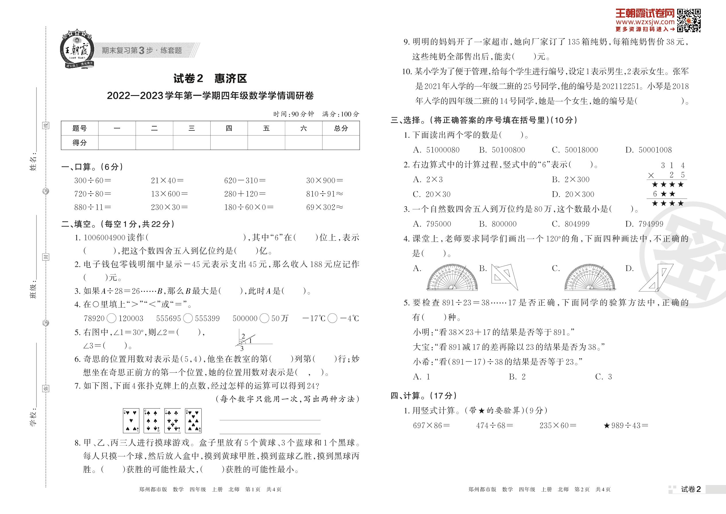 惠济区2022—2023学年第一学期四年级数学学情调研卷(北师版)【2】