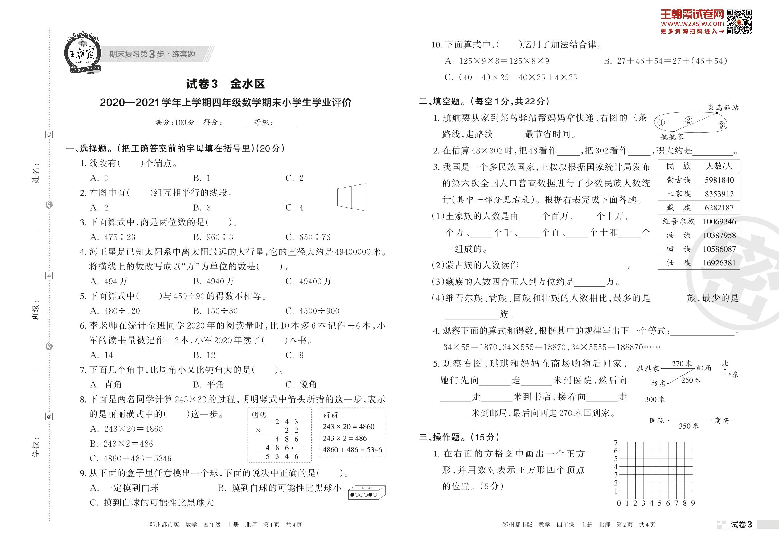 金水区2020—2021学年度上学期四年级数学期末小学生学业评价(北师版)【3】