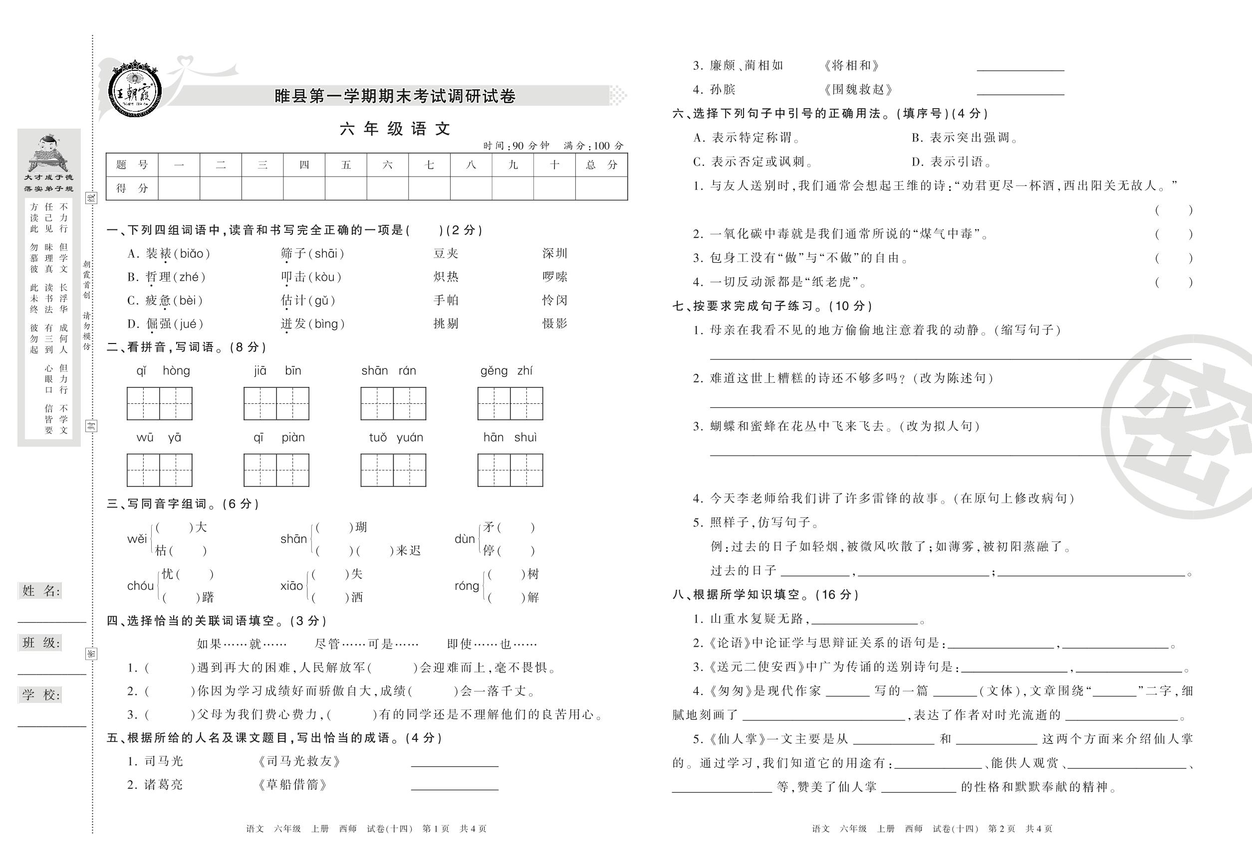 2016-2017学年第一学期商丘市睢县六年级语文试卷(西师版)【14】