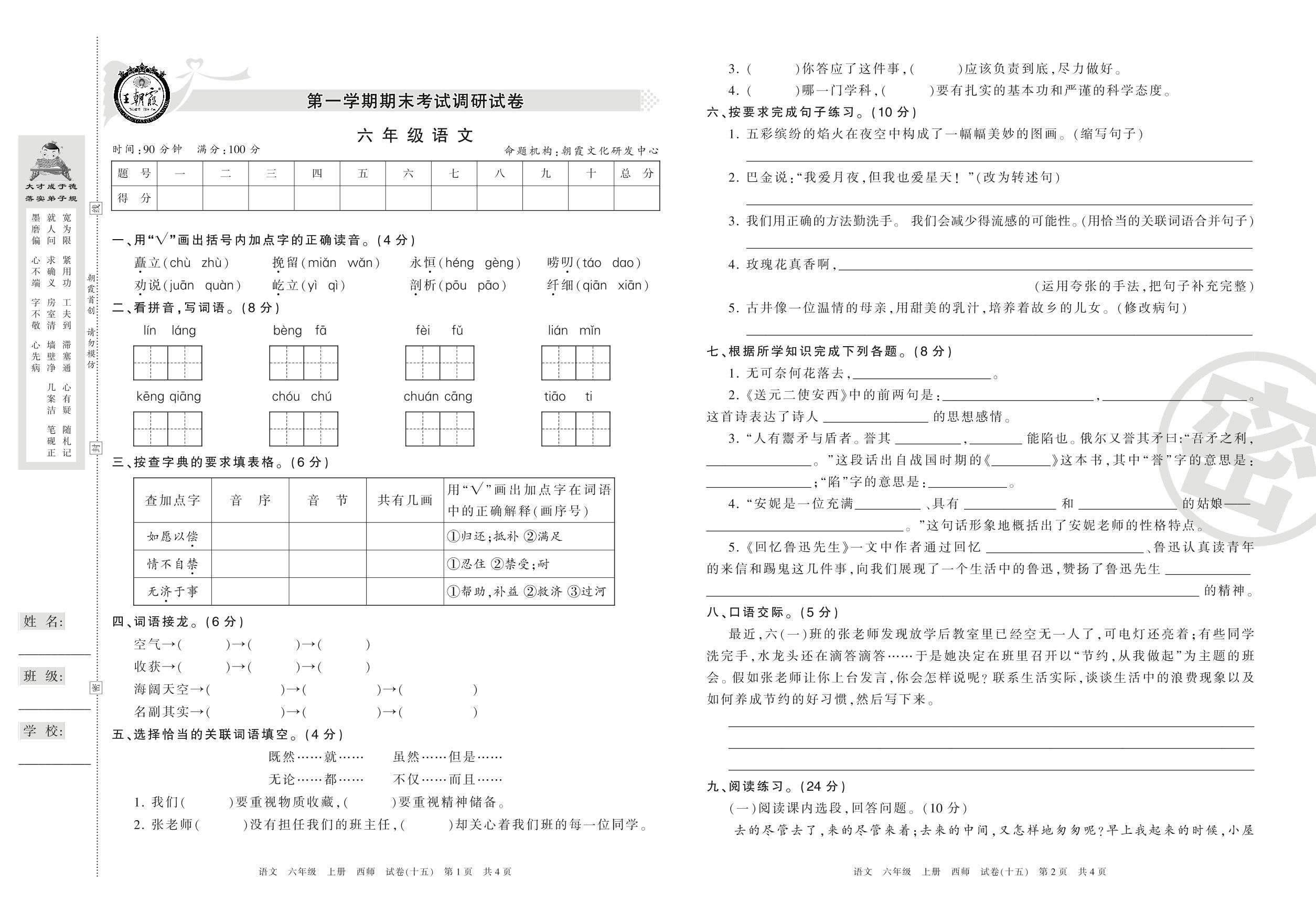 第一学期期末考试调研试卷六年级上册语文(西师版)【15】