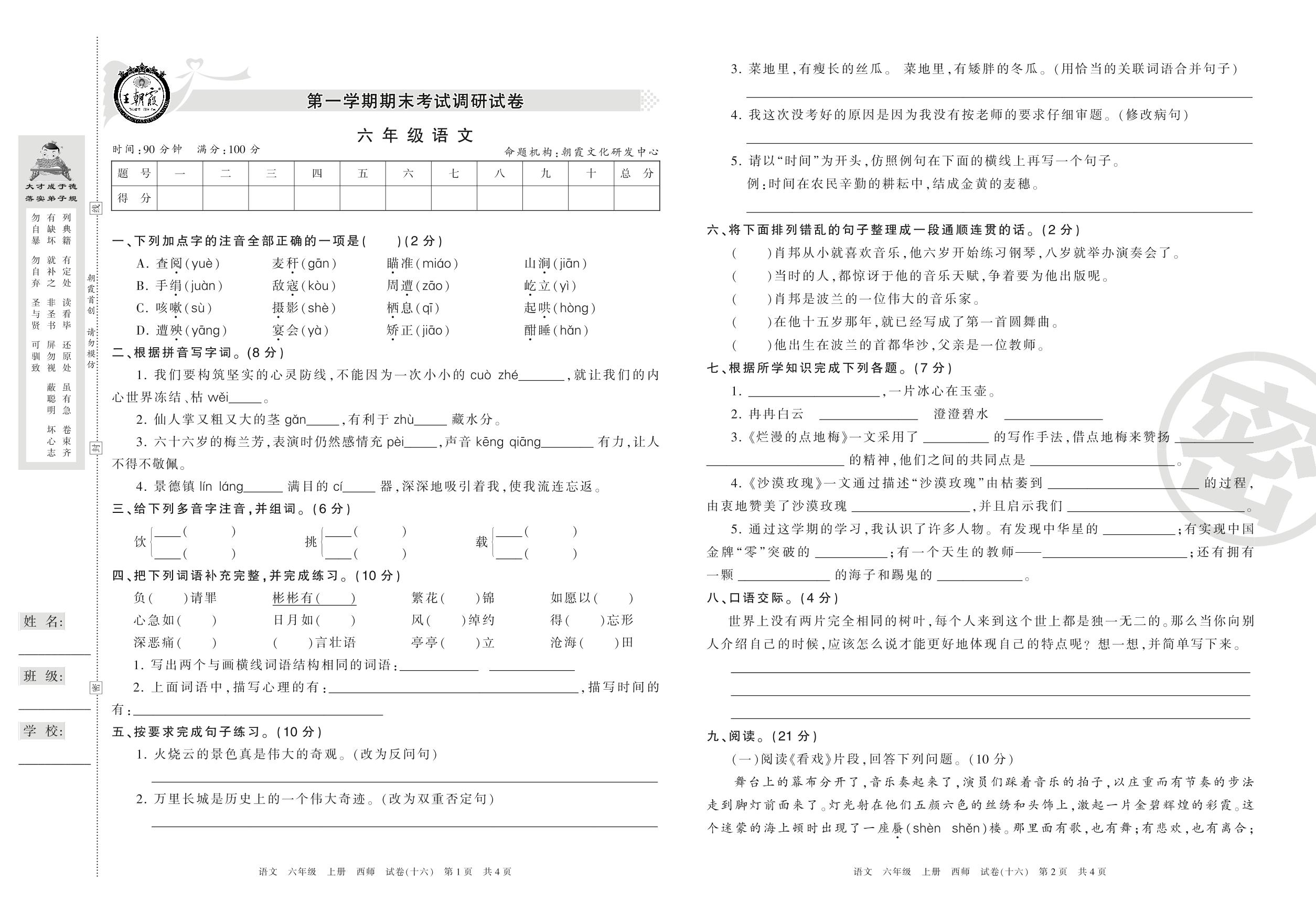 第一学期期末考试调研试卷六年级上册语文(西师版)【16】