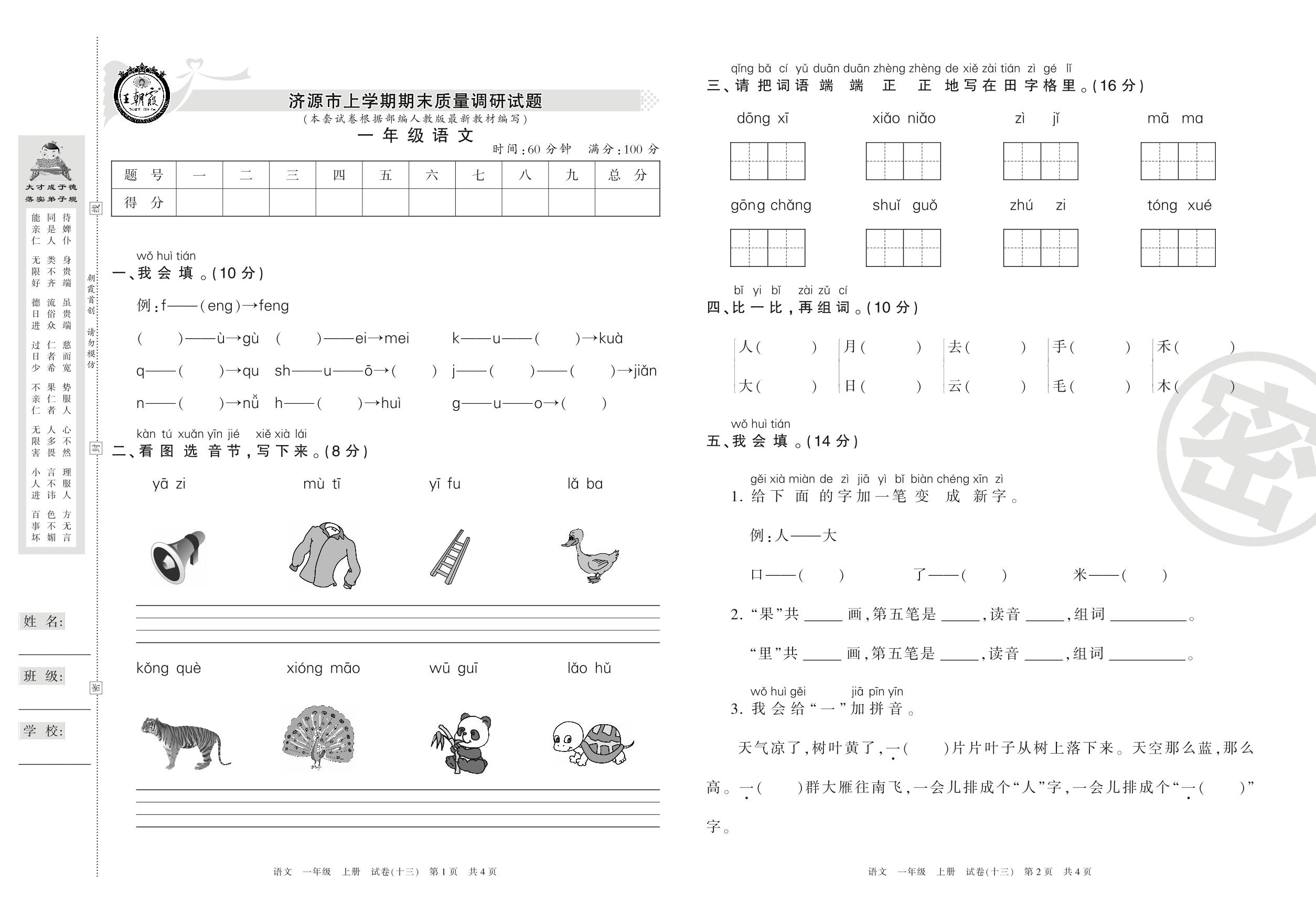 2016-2017学年第一学期济源市一年级语文试卷(人教版)【13】