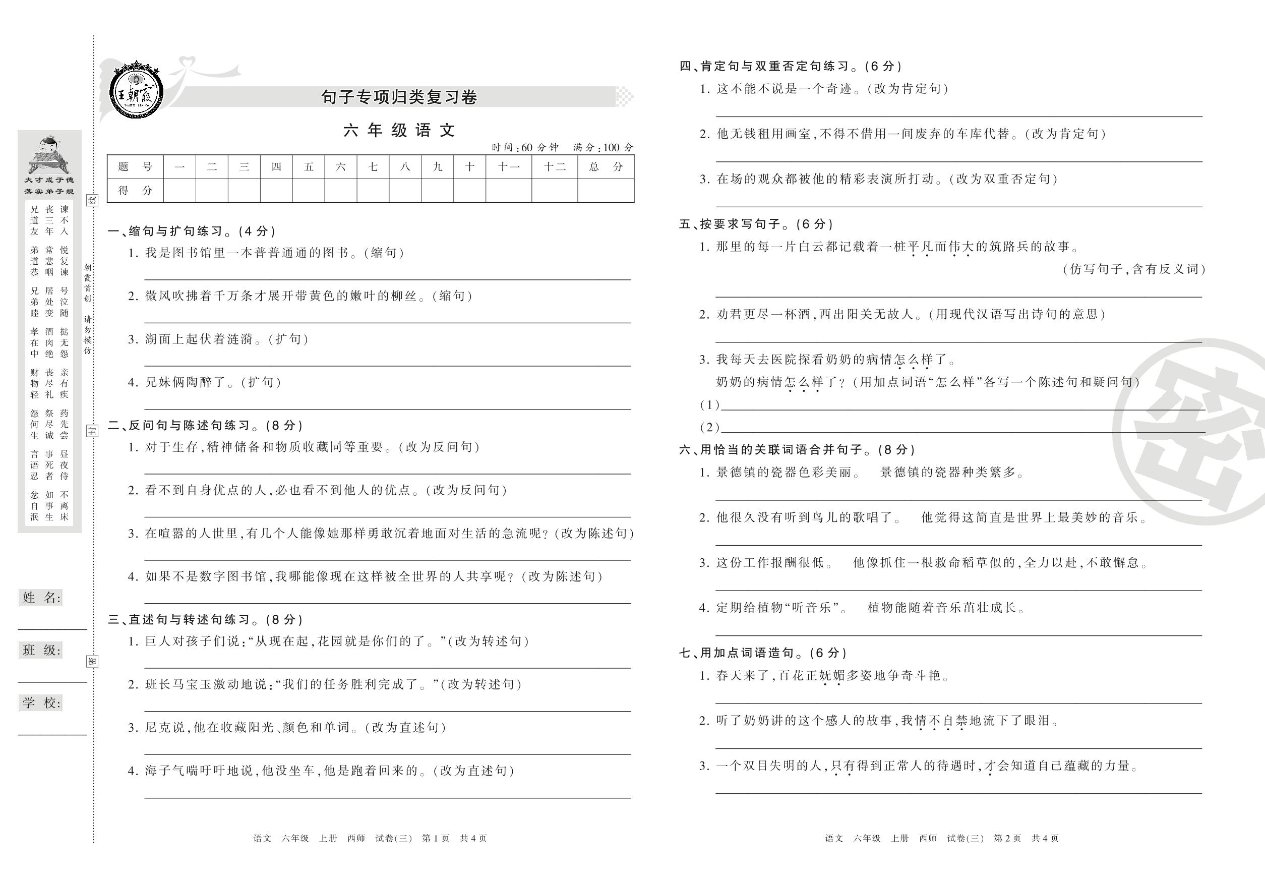 王朝霞期末专项卷六年级上册语文(西师版)_R210802113612【3】