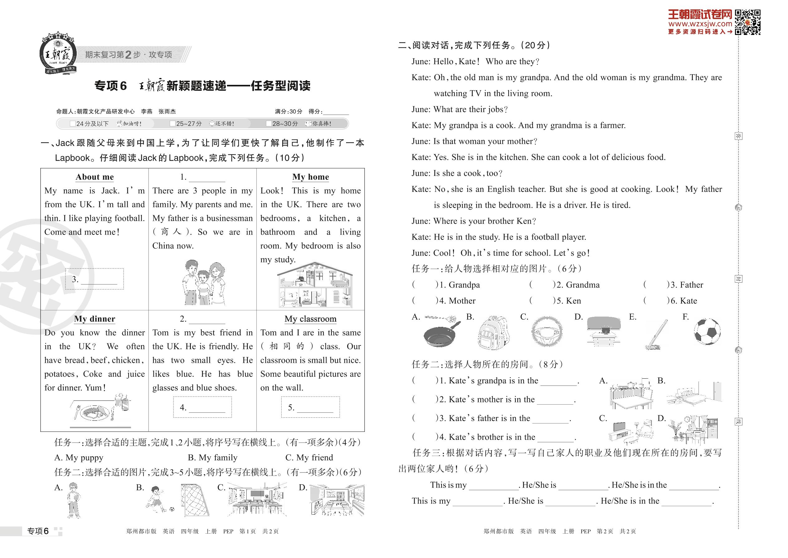 王朝霞期末专项卷——王朝霞新颖题速递:任务型阅读四年级上册英语(PEP版)_R221112152140487【6】